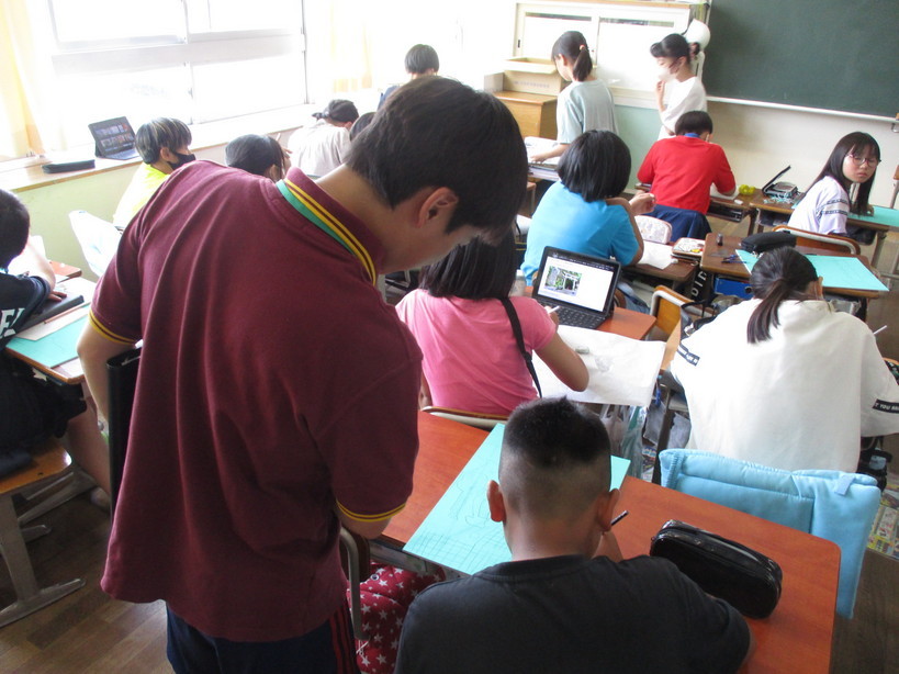 今週(24〜28日)は、先生になることを目標に勉強している東海大学児童教育各部2・3年生の学生2人が「学校体験活動」として金目小に来ています。 今日は1年生のプールや、6年生の図工の彫刻刀の作業で、学習のサポートをしてくれました。 子どもたちにとって、休み時間には一緒に思い切り遊んでくれる素敵なお兄さんたちです。 |