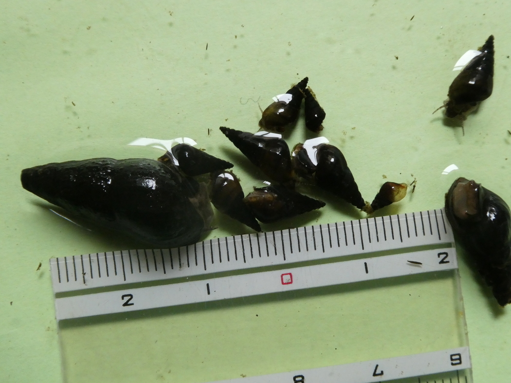 ≪金目のゲンジボタル≫ 人工飼育における孵化直後の幼虫に与えるカワニナと水の取り換え ゲンジボタルの種ボタルが産卵した日から21日経った6月12日に孵化しました。孵化した幼虫の体長は2mmほどの大きさで、産卵床の水中に沈んでいる(浮いているのもいる)ときは、まるでごみが沈んでいる(浮いている)かと間違うほどです。幼虫とごみの判断は動きがあるか否かで判断します。動きのあるものをスポイドで吸い上げて、別の容器(バッチ式飼育容器)に移して飼育します。写真1、写真2、写真3孵化した幼虫(1齢幼虫)はカワニナを餌として5回ほど脱皮(脱皮するごとに2齢、3齢幼虫、・・と呼ぶ)を繰り返しながら終齢幼虫(6齢幼虫)へと成長していきます。終齢幼虫になると3月中旬の雨の夜に水中から土手に這い上がり、土に潜って土繭(まゆ)を作り、その繭の中で蛹になります。蛹は16,17日ほどで成虫となって飛び回り、子孫を残して1年間の短い一生を終えます。なお、成虫での生存期間は7日〜10日ほどです。 一方、ゲンジボタルの餌となるカワニナは、春から秋にかけて仔貝を産みます(卵胎生:親と同じ姿形で生まれる)。仔貝は一年以内に成熟します。成熟したメスはオスと交接し、精包に入った精子を受け取ります。メスはこの精子を体の中に貯蔵し、少しずつ使って受精させて仔貝を産み続けます。産仔(子を産むこと;産卵ではないことに注意)は春と秋に多くなります。 金目親水公園池から流れ出る水路にカワニナが棲んでいます。この時期(6月中旬)にカワニナを採集すると25〜30mmの成貝や、4〜5mmほどの小さな仔貝も多く採取されます。写真4 このようにゲンジボタルの孵化時期にたくさんの仔貝が産まれることは、孵化したばかりのゲンジボタルの成長にとって非常に重要なことです。 というのは、自分よりも大きなカワニナを餌としてアタックすれば、カワニナは驚いて蓋を閉じます。その時、カワニナの殻内に閉じ込められたり、殻と蓋に挟まって絞め殺されたりします。したがって、ゲンジボタルの幼虫は自分よりも大きなカワニナを餌にすることはできません。大きなカワニナだけがたくさん居てもゲンジボタルの幼虫にとっては餌がないのと同然です。自然界ではゲンジボタル幼虫の体長に見合った色々な大きさのカワニナが棲息していることが必要なのです。 ところで、人工飼育ではゲンジボタルの幼虫と同じ大きさのカワニナを選択的に採取して給餌することは大変面倒くさい作業になります。そこで、幼虫がある程度の大きさに成長するまでは成貝のカワニナを殻ごと叩き潰して与えることになります。しかし、このことによって、カワニナの腐敗が早く進み、容器の水が汚れと酸素不足になります。そこで食べ残しの餌の除去して頻繁に水を取り替え、常時空気を送り込む必要があります。また幼虫はまだ体力がないので水温(28℃以下)にも気を配らなければなりません。孵化後の一ヶ月余りは最も手間がかかる飼育期間となります。 このような苦労があるからこそ幼虫に愛着が湧き、また成虫となって夜空を飛び回る喜びはひとしおです。皆さんも機会があったら飼育を試みてはいかがでしょうか。 (ふぁいあ ふらい) |