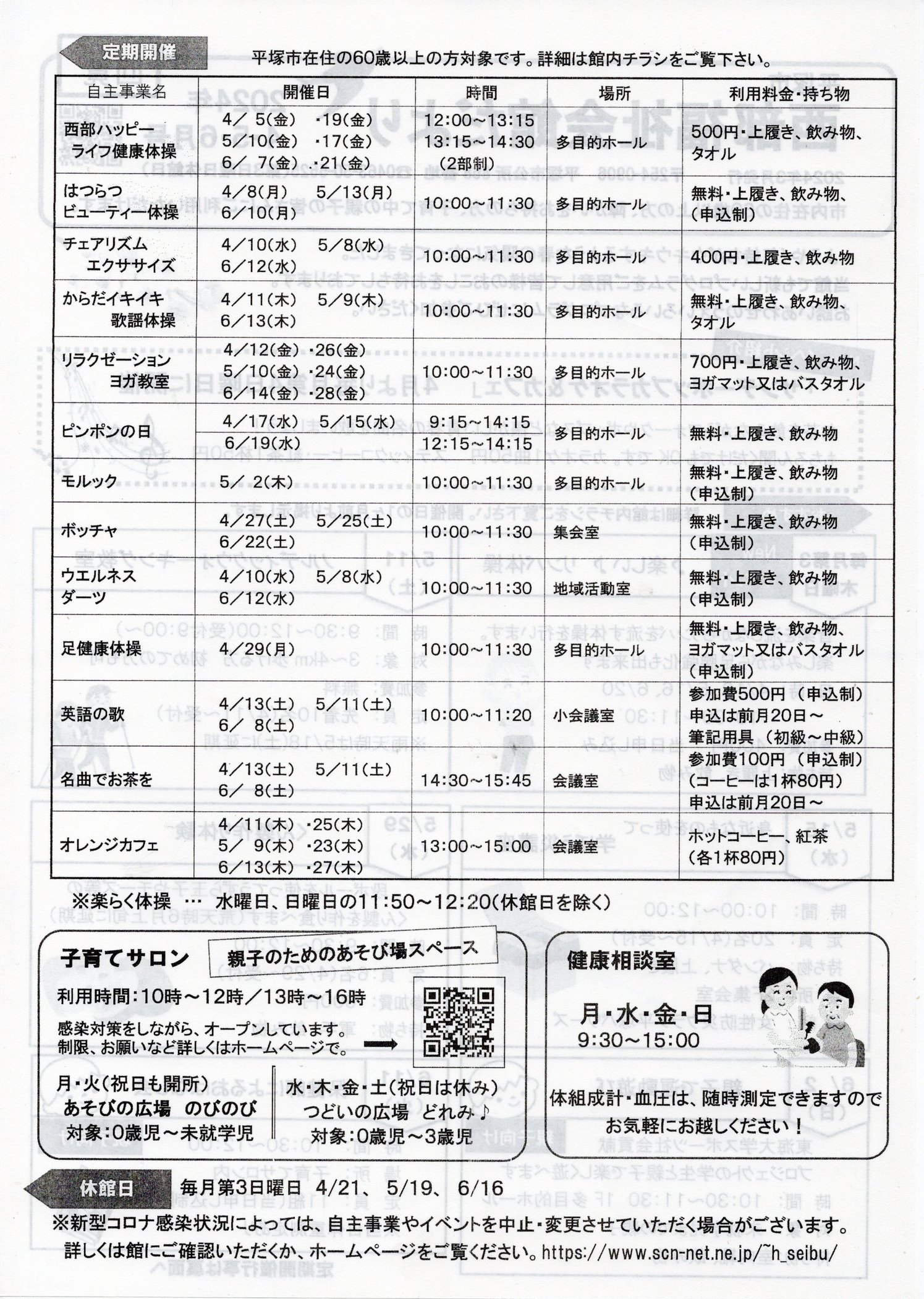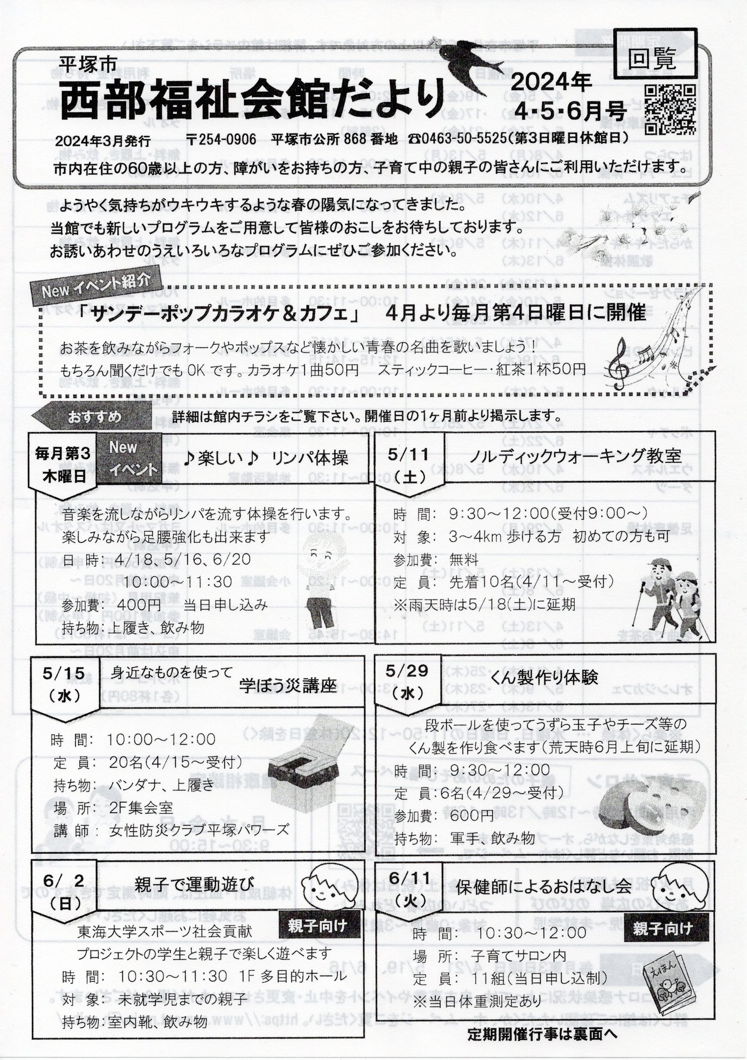 ○新年度を迎えて ○金目公民館 地区公民館長交代のお知らせ ○お世話になりました(人事異動の紹介) ○おはなしの会(お休みします) ○すくすくっこ 〇ひまわり文庫 ○おはなしの会と自然観察会 ○親子ホタル観察会 ○金目公民館ふれあいまつり 無事に開催しました! ○焼きたて 美味しい! 親子パン作り教室 ○2024金目エコ わかば祭り ○竹を使った!?親子バウムクーヘンづくり ○第48回 平塚市緑化まつり |