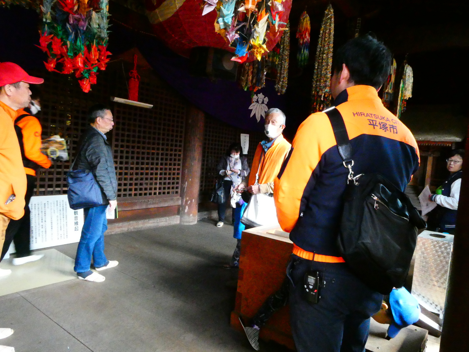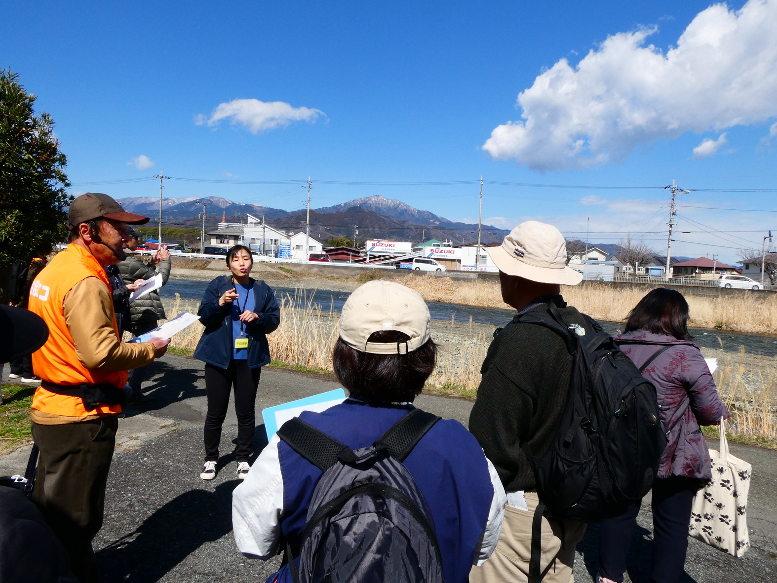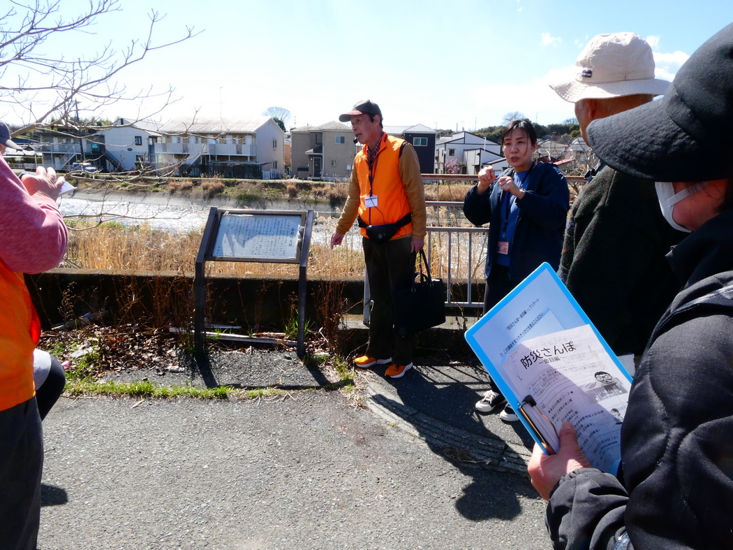 「防災さんぽ」で金目エコがガイド 3月9日(土)9:00〜12:00 まちをのんびり歩きながら、災害に関連するスポットなどを巡る「防災さんぽ」が開催されました。「防災さんぽ」は、防災に観光的視点を取り入れた、ガイドツアー型の「防災×まちの魅力発見イベント」で、このイベントを通して、参加者に防災についてより身近に感じていただくとともに、平塚市の魅力を発信していくことが目的だそうです。 平塚市災害対策課が主催で令和4年3月から始まり今回で7回目です。 参加者は子供を含めて11名。耳の不自由な方がいましたが、手話通訳付きでした。 当日は前日までとは打って変わって朝から快晴で、雪を被った富士山もくっきり見える最高の天気。 各地点のガイドは金目エコ会員が担当。マイク使用、イラスト、写真等を提示しながらの説明には参加者の方々は真剣に聞き入り頷ずく姿が見られました。 最終地点金目観音において、「防災さんぽ」の主旨として金目地区自治会連絡協議会会長の秋山博様から昭和20年10月金目川の氾濫について話を聞かせていただきました。80年近く前、10歳未満の体験ですが、今でもその光景は目に焼き付いて忘れないそうです。 金目地区2回目の今回は下記コースを巡りました。 ➀塚越古墳公園集合 金目地域の全望と古墳説明(平成23年開設、県内最大規模の前方後方墳で有名) ➁北金目神社(春日造り、市内の自神社建築では最古。市指定重要文化財。象の彫り物) Bおおくぼ公園 (真田・北金目地区遺跡からの出土品案内板設置) C金目親水公園(平成12年開設。自然型公園。5月〜6月ホタルが飛び交う) D河身改修整理耕地竣工記念碑(明治43年大水害、44年洪水が発生。自然災害伝承碑として令和4年8月26日、国土地理院に登録) E大堤(御所様堤)(1609年に徳川家康が築く。長さ572m) F光明寺解散(天台宗の寺院。山号は金目山。本尊は聖観世音菩薩で金目観音とも称される。坂東三十三観音第7番札所) 以下の写真は、金目地区のサテライトの魅力と災害・防災について語るエコ会員の活躍の様子です。 (金目エコ広報 T.K) | |