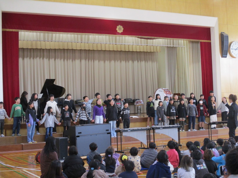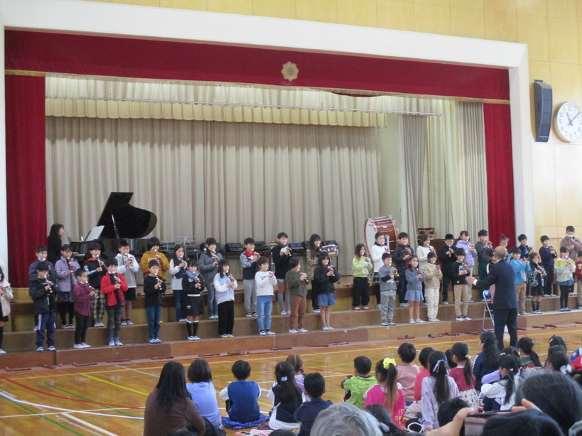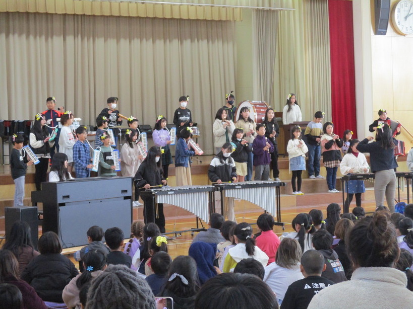 心配された感染症の流行も治まり、欠席児童の少ない中、音楽学習発表会を実施することができました。 <午前の部> ○1年生 合唱「まねっこまねまねくじらぐも」 合奏「聖者の行進」 ○3年生 リコーダー奏「うんめいだ」 合唱「おはようのエール」 カスタネット奏「スペインのカスタネット」 <午後の部> ○5年1組 合唱「大切なもの」 合奏「新時代」 ○5年2組 合唱「小さな勇気」 合奏「アイドル」 午前午後ともに子どもたち渾身の演奏で、100人を超える保護者・地域の方々に感動を与えてくれました。 子どもたちからも「楽しかった〜」という声をたくさん聞くことができました。一人一人違う声、楽器の音が1つに重なり合う心地よさ感じてくれたのだと思います。 | ||
