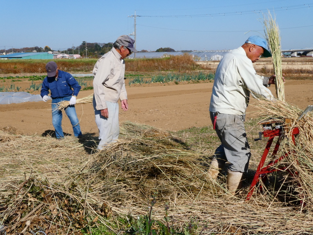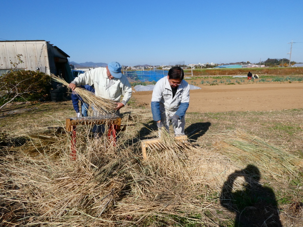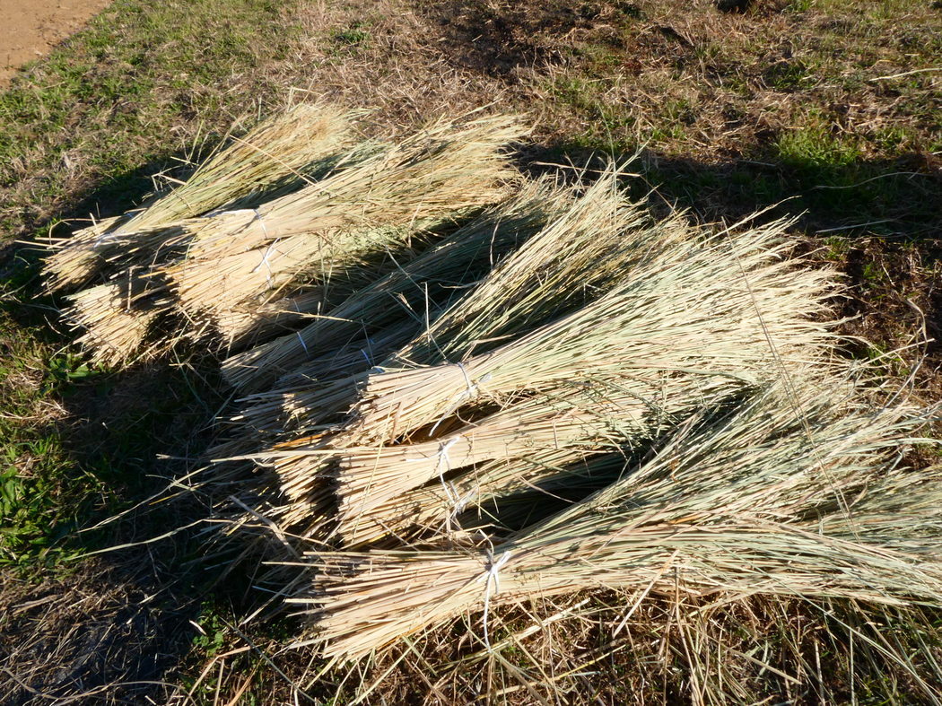 お飾り作りの準備 わら漉きを行いました! 年の暮れに開催される恒例の「お飾り作り」(12/16(土)開催 金目公民館主催/金目エコ協力)の準備のため、金目小学校の5年生が≪米作り≫で刈り取った稲のわら漉きを行いました。わら漉きには金目エコ会員が手作りわら漉き機2台を使って、会員5人が約1時間半弱を費やして、当日1人当たりに配られるわら束を約40束作りました。 なお、当日はお飾りを作る際に折れないように少し湿らせて渡され、金目エコ会員が中心となってお飾り作りの指導をすることになります。(Y.Y) |