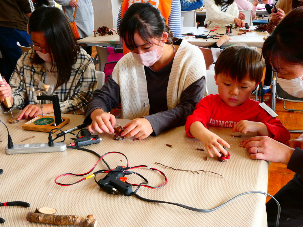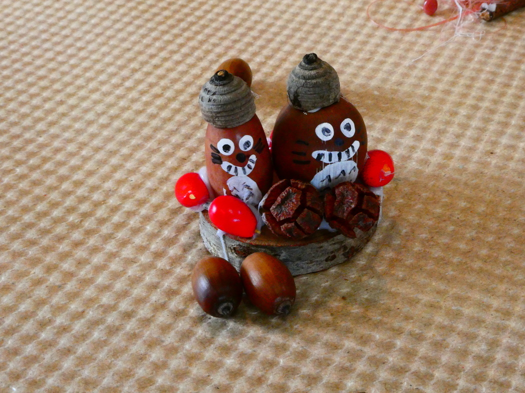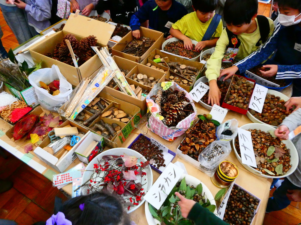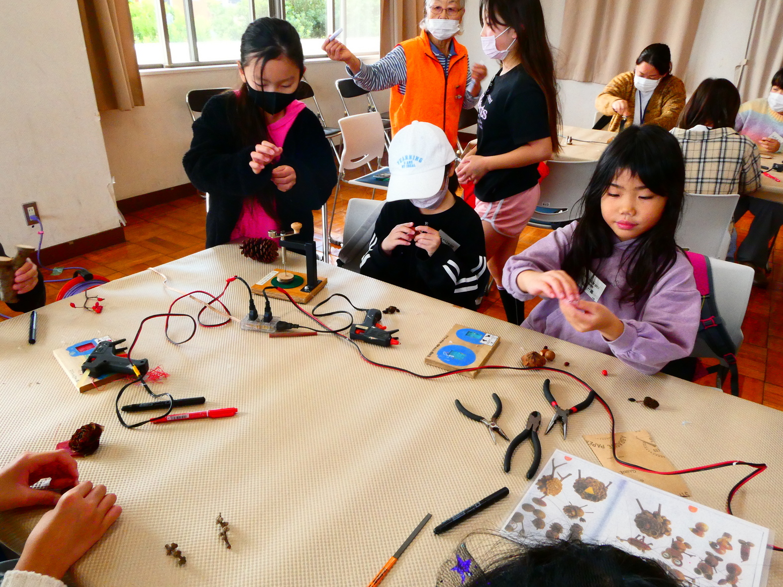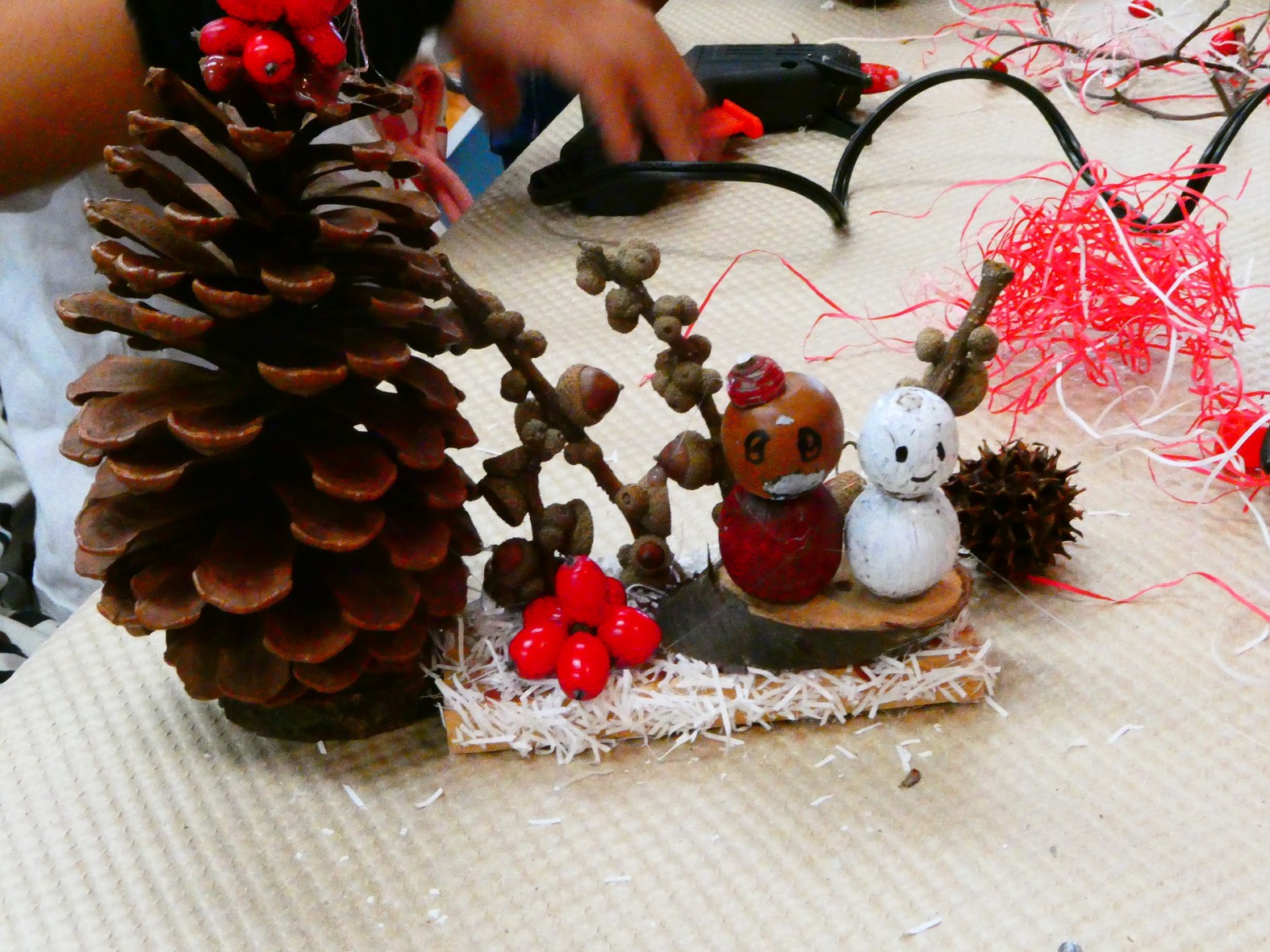 ‘’どんぐり工作‘’を開催しました! 11月23日(祝)毎年楽しみにいている‘’どんぐり工作‘’が金目エコミュージアムと金目公民館のコラボ企画で行われました。 金目エコ会員の皆さんが様々などんぐりや自然物またちょっとした日用品の端材など豊富な材料を用意してくださいました。また朝早くから子ども達が試作し易いようテーブルセッティングなどの準備をいただきました。 どんぐり集めから子ども達と一緒にするのが理想的ですが、日程的に無理なため、パワーポイントによるどんぐりの解説がありました。葉・花・実の特徴や何処に生えているか? など、こども達も静かに見入っていました。 製作に入ると、見本を参考にしたり、自分で考えたりして作品を作りました。考えがまとまらない時には金目エコ会員のさりげないアドバイスもらったり、不慣れな道具の使い方を教わったり、手伝ってもらったり。ちょぴり甘えている姿も見られ とても微笑ましい情景でした。 作品はメルヘンの世界のものや、机の上の飾りやクリスマスツリーなど とても華やかでした。 「公民館だより」を見て、とても大きな松ぼっくりを匿名で届けて下さった方や、参加者にコナラの殻斗(帽子)を使った手作りブローチを届けて下さった柏木様、この場をお借りしてお礼申し上げます。このようなご協力のおかげでこの事業がより心豊かなものになりました。 さらに、いつもながら、金目エコ会員の子ども達へのあたたかな対応や指導と金目の自然に感謝いっぱいの一日でした。 (金目公民館館長 蜷久子) |