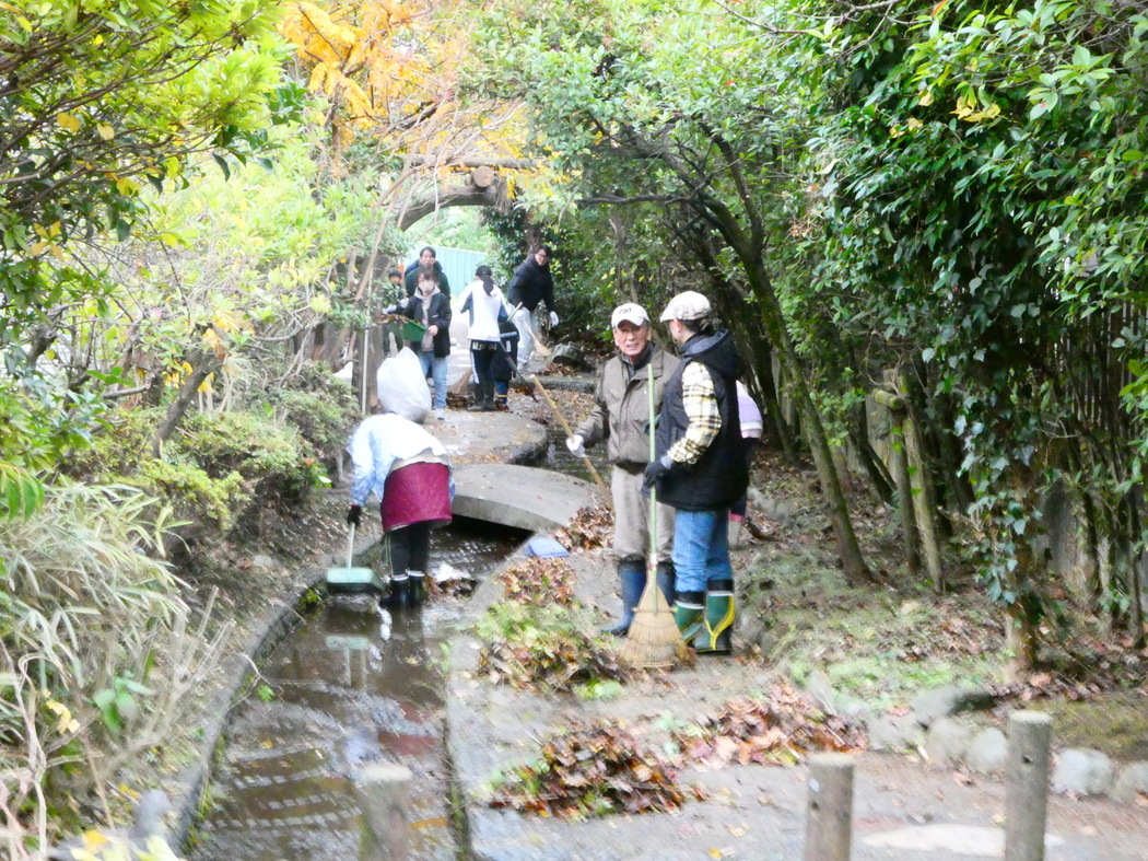 秋の町ぐるみ大清掃 朝から霧雨の中、北金目の大久保地区では午前8時少し前から自治会役員や各種団体、子ども育成会と子どもたちが割り当てられた自治会会館、神社、せせらぎ水路などに帚や塵取り、ビニール袋をもって集まり、午前8時から清掃開始。人から指示されることなく手際よく、ごみ(空き缶・瓶類・プラごみ)を拾い集めて分別し、更に多量の落ち葉を掃き集めて大掃除をしました。また写真を撮って帰る頃には各家の前の道路もきれいに清掃されていました。 みんなで一緒になって清掃する町は、町も住人の心も清いと感じます。このような町で生活できることに幸せを感じるとともに感謝しています。(Y.Y) | ||