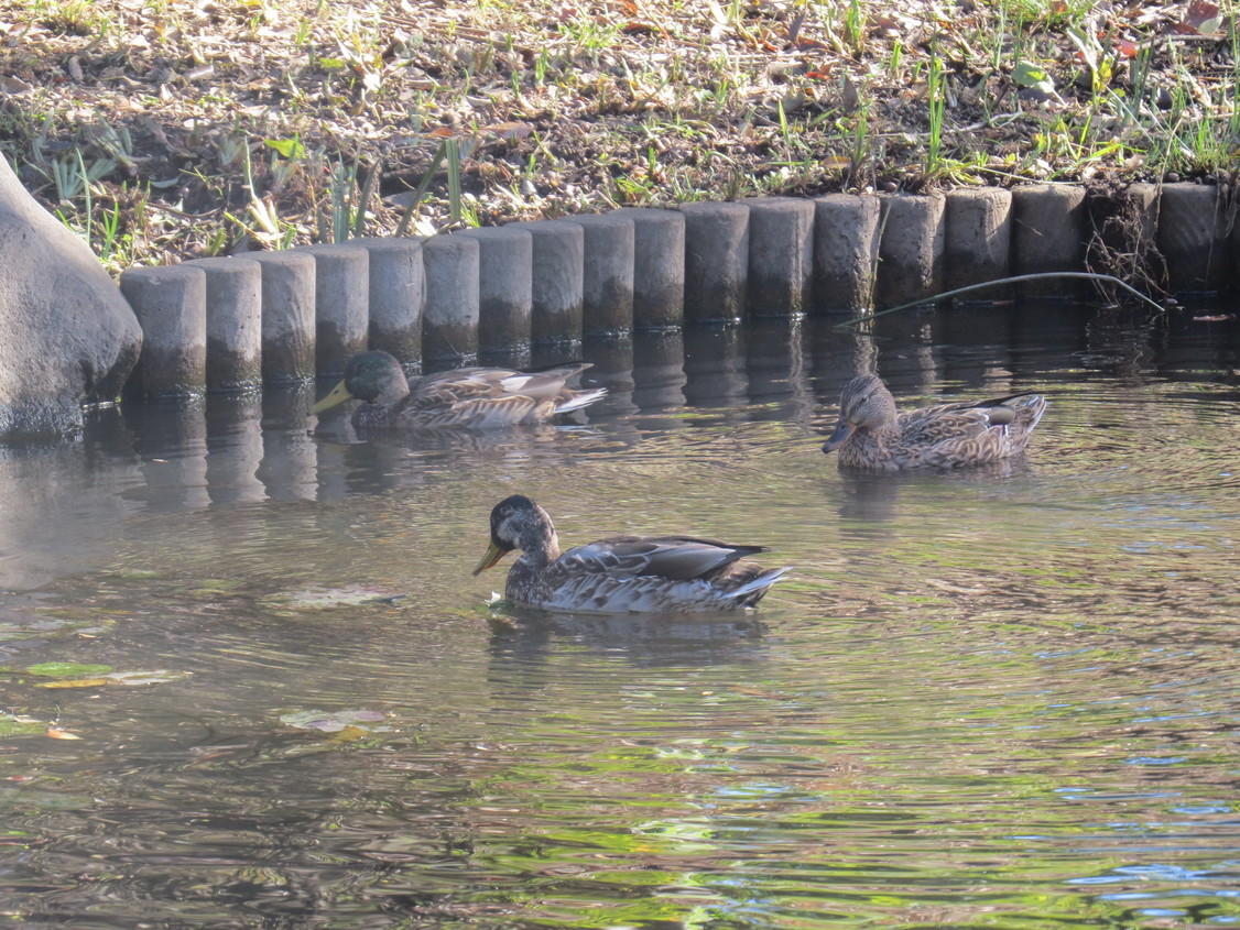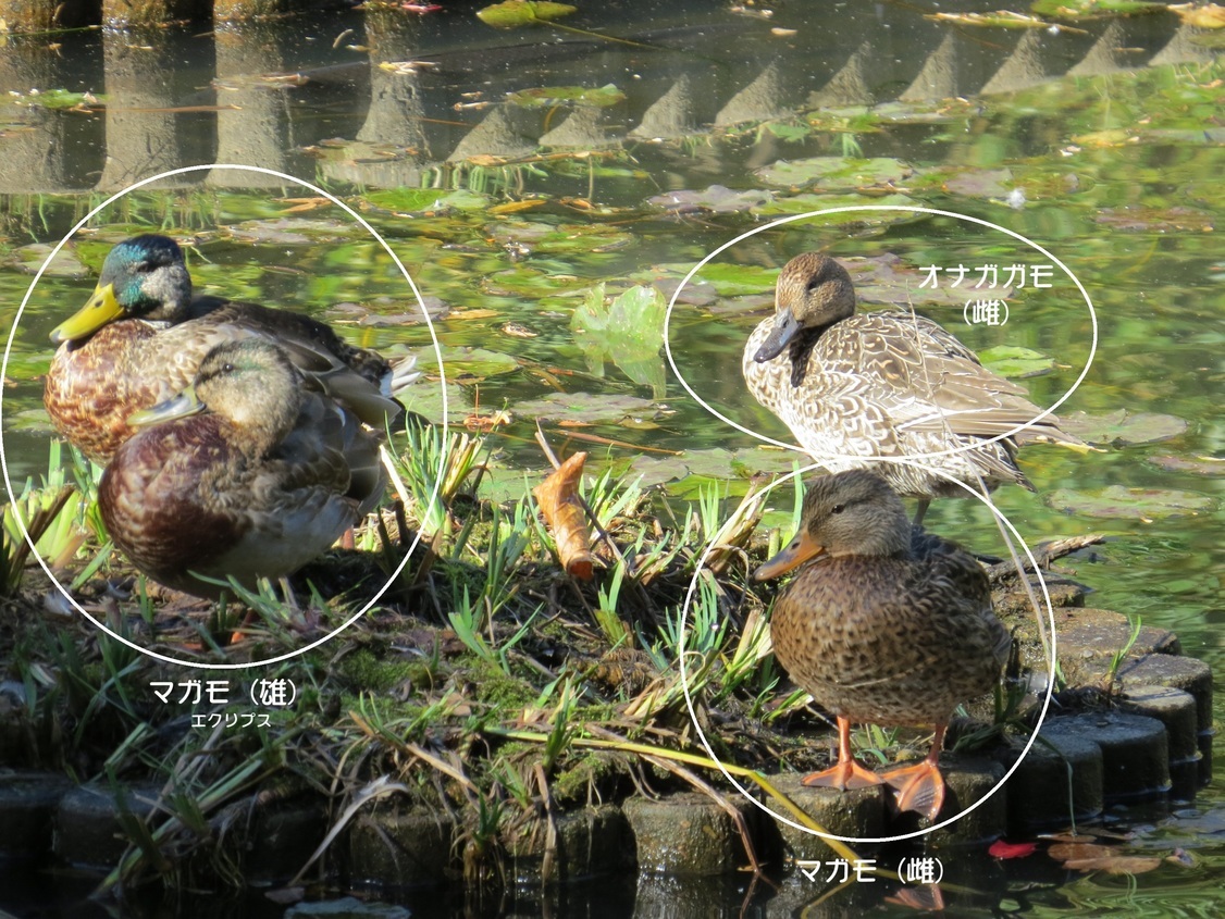 ≪金目の自然≫ 今、金目親水公園池でマガモのエクリプスが見られます! 11月18日午前10時前に金目親水公園へ出かけました。公園池にカルガモ39羽、オナガガモ1羽(雌)、更にマガモ9羽がやって来ていました。カルガモは今季最大の飛来数で、マガモおよびオナガガモは今季同公園池へ初めて飛来しました。 マガモ9羽の中に、頭部に光沢のある緑色で、胸との境に白い首輪を付け、黄色の嘴で明確に判別できる雄が2羽(写真1 白の円内、黄色の円内は雌)。 更に雄雌判別が難しいマガモ3羽が見られます。これはマガモの「エクリプス」といって雄が冬羽へと換羽している最中の姿です(写真2:左の2羽がエクリプス、最右端は雌のマガモ)。 今がチャンスです。ぜひ、マガモのエクリプスを見に来られては如何でしょうか。 オナガガモ(雌)がカルガモやマガモに紛れて来ています(写真3 右側の上の野鳥、写真4)。 昨年の例だと2,3日は池に居続けますのでオナガガモも一緒の観察してください。 なお、双眼鏡を持参されれば野鳥の羽、嘴の色・模様、脚の色の違い、また公園を取り囲む林の紅葉を拡大して見るのも楽しいものです。(Y.Y) |