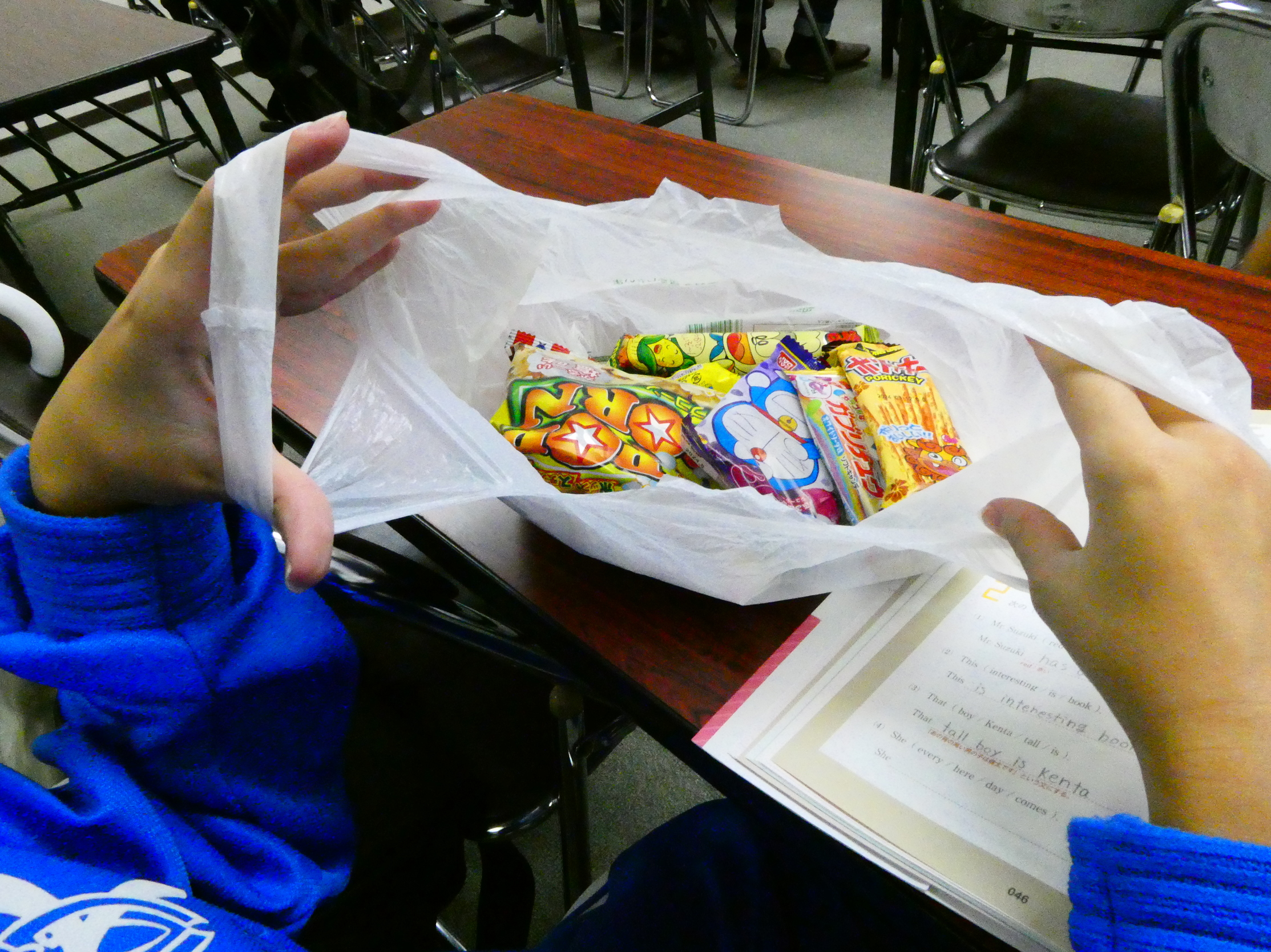金目の寺子屋(11月-1)を開催しました! 金目の寺子屋が、前回の10月17日から数えて3週間後の11月7日午後5時から午後7時まで、金目公民館A会議室で開催されました。参加したのは小学生5名、中学生6名、学習支援者6名、保護者3名でした。この日の小学生たちの主な学習科目は国語と算数で、国語は教科書の内容と離れて、漢字の入った10個の文章(裏には漢字が読めるようにふりがな付きの表と同じ文章)を如何に早く読むか。タイムトライヤルを競う問題である。1回(10個の文章)終了する毎に記録を付けていく。その時間を10秒を切ったらOKマークをもらう。このことによって体で漢字を含んた文章を読む力を付ける学習法です。 算数は、△△(km、m)の距離を〇〇時速(分速、秒速)で行けば何時間(分、秒)かかるかと云う文章問題を解いていました。 一方、中学生は英語に最も時間をかけて学習(現在進行形ingの付け方、更に進行の状況を付加説明するため単語の導入の仕方)でした。次に多くの時間を費やしいたのが社会・地理に関する学習でした。地図帳を広げて一生懸命地図と睨めっこし、どうしても解決できない時は学習支援者にアドバスをもらっていました 休憩時間には写真のようなお菓子をもらって暫くの休息、また帰り際には金目地区社会福祉協議会からレトルトカレー1箱(4パック入り)の差し入れがあり、「帰ってからの夕食はこれにしよう」と元気よく嬉しそうに帰って行く姿が印象的でした。 尚、次回は11月21日(火)の午後5時から7時まで金目公民館 A会議室で開催されます。 金目の寺子屋へ新しく参加を希望の方は、以下のPDFをご覧ください。 | |