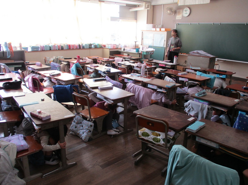 緊急地震速報を想定したシェイクアウト訓練を、今回は事前予告なしで実施しました。 速報後、子どもたちは机の下にもぐり、しっかりと机の脚をおさえました。 約2分間の揺れが続いている間、金目小学校は静まりかえり、子どもたちの真剣さが伝わってきました。 「自分の命は自分で守る」 いつどこで発生するか分からない災害にも冷静に対処できるよう、金目小学校では安全防災教育を繰り返し行ってまいります。 | |
