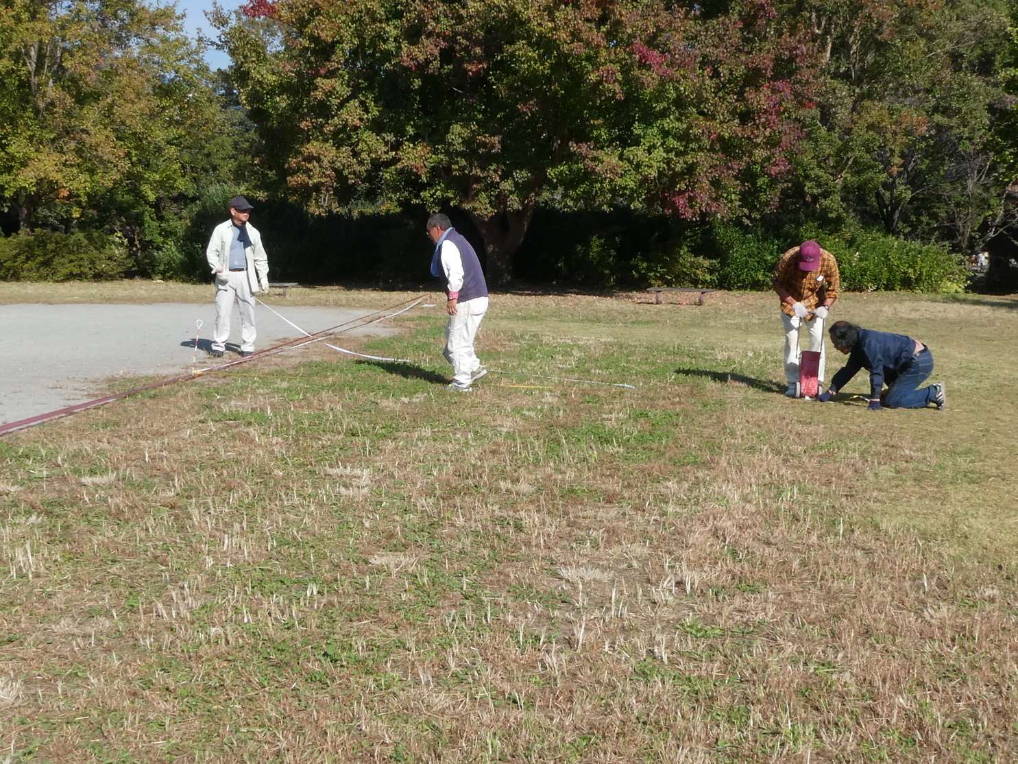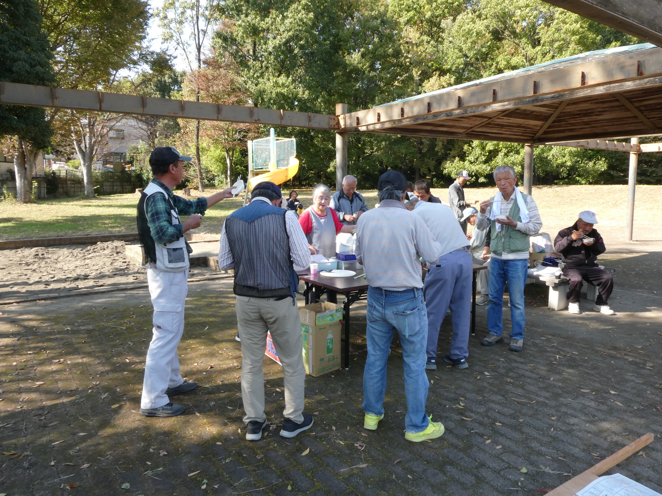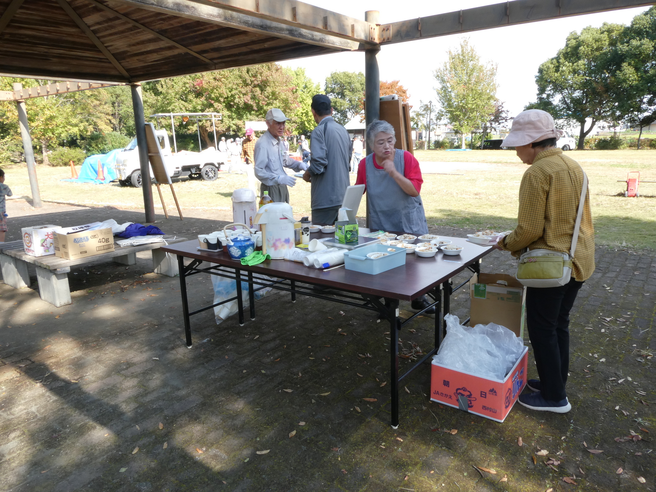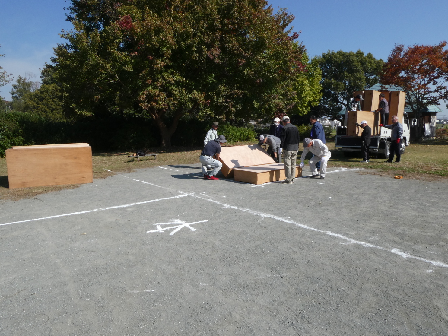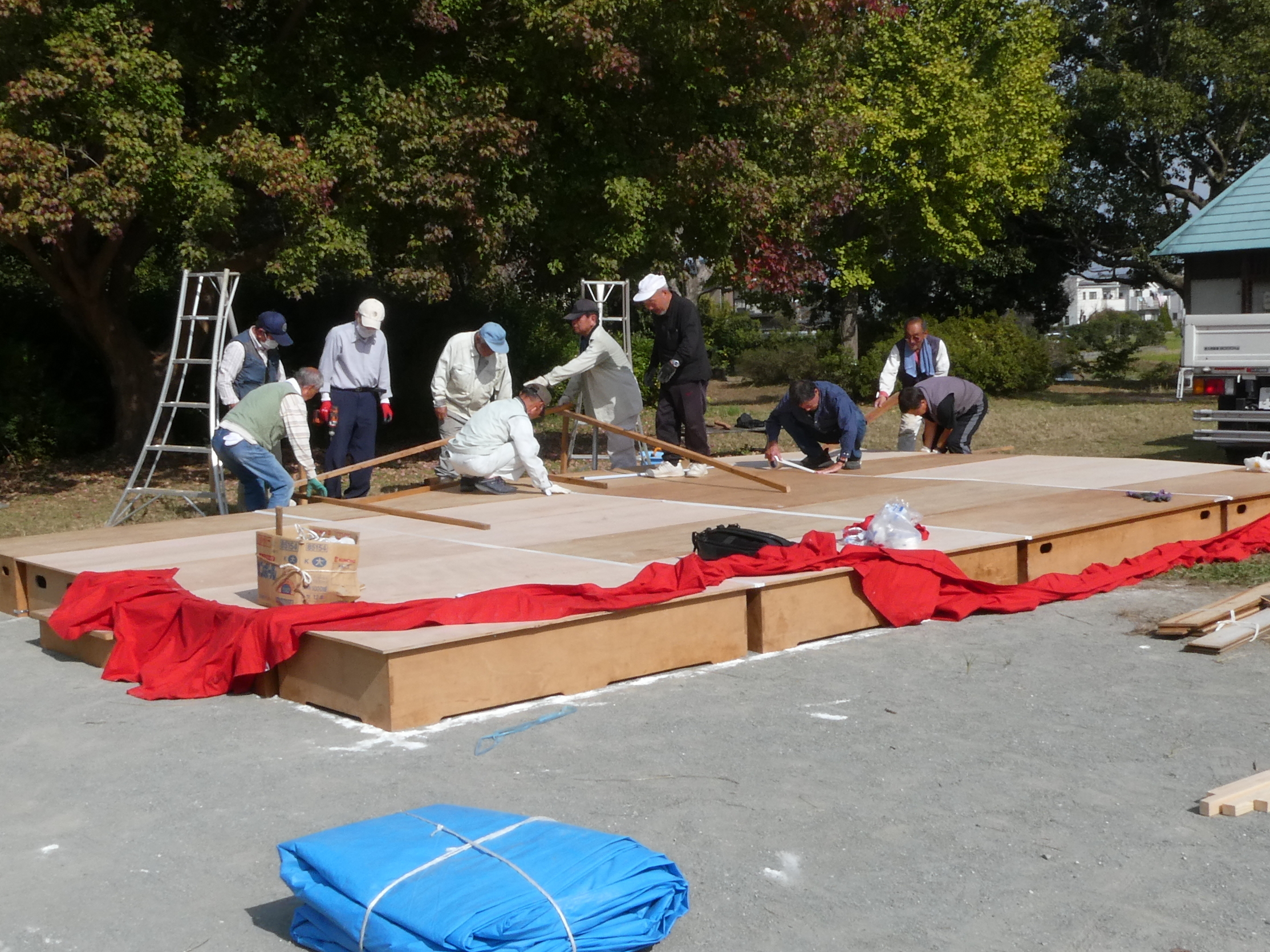 金目の収穫祭の準備を行いました! 11月4日午前9時から金目エコ会員(約20数名)が、明日(11/5)に開催される「第15回 金目の収穫祭」の準備のため、3tトラック1台、軽トラック6台を使って、金目公民館倉庫から演舞台(20畳分)、テント(3張)、椅子100脚、長机(14)、その他諸々の必要機材を金目親水公園まで運んで会場設営を行いました。会場設営が終了したのは13時30分過ぎでした。なお、開催当日(5日(日))は10時より式典、「フリーマーケット」で掘り出し物探し、中学生による「柔道演武」や地元の皆さんによる「演芸」y「金目の祭り太鼓」等の披露、さらに「高齢者よろず相談所」の開設、「収穫祭ラッキーナンバー抽選会」などあります。奮ってご参加ください!(Y.Y)上段写真 左から 舞台の運び出し 会場でのライン引き 舞台設置 下段写真 左から 舞台組み立て 昼食準備 皆で昼食 |