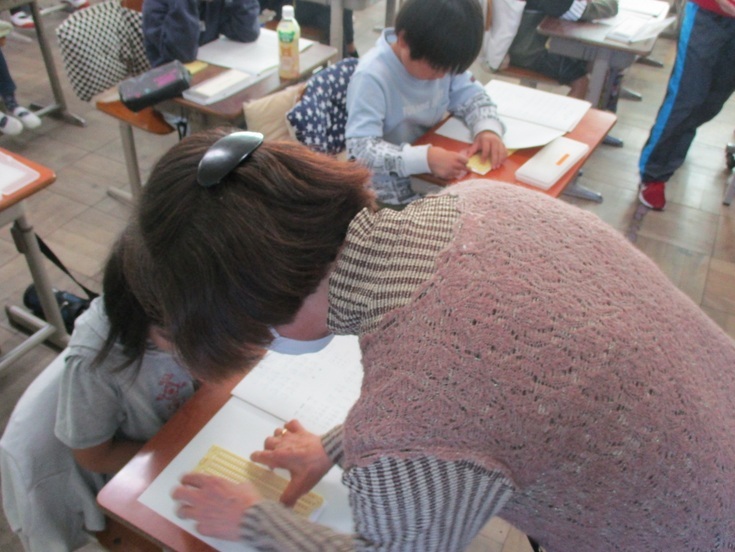 3年生の福祉学習で、先日は視覚障がいのある方をお招きしてお話を伺いましたが、今日は「平塚点訳赤十字奉仕団」の方々に来校いただき、点字・誘導体験を行いました。 子どもたちは点字の基礎を教えていただき、実際に点字を作成する活動を行いました。また、目隠しをして白杖を持ち、ペアの友達に誘導してもらうという視覚障がい者の体験も行いました。 来月は「車いす体験」が予定されています。 |