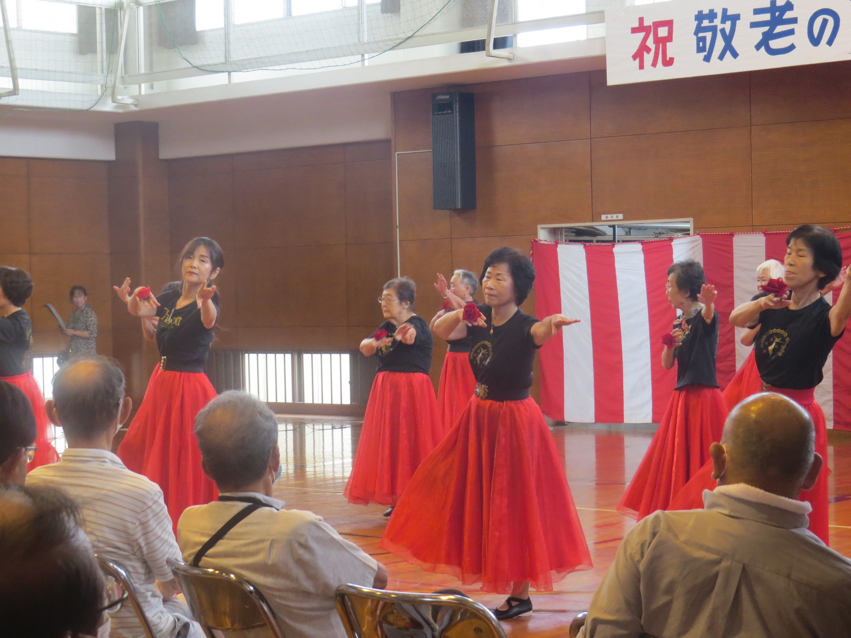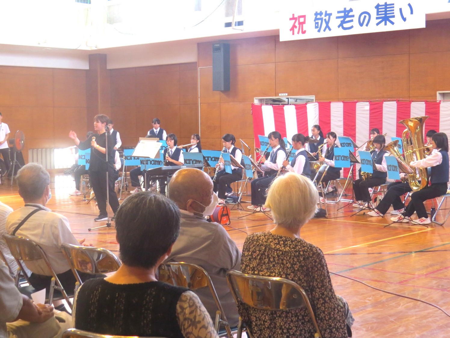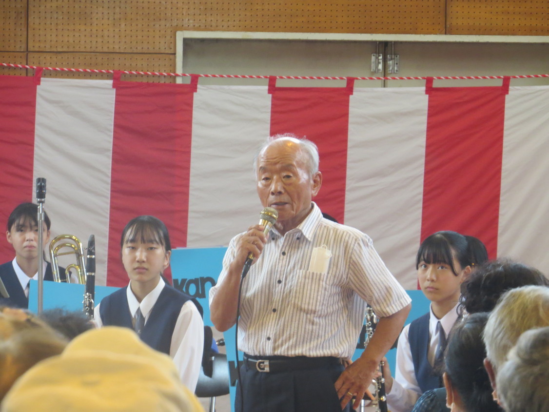 「敬老の集い」が開催されました! 金目社会福祉協議会を金目の5団体共催の「敬老の集い」が10月1日午前10時から金目公民館体育館で開催されました。 この敬老の集いは金目地区に住む77歳以上(昭和21年10月1日以前生まれ)の方を対象に行われ、紅白饅頭と、赤飯またはカレーセットが400人の出席者にお祝い品とが配られました。 また10時30分から体育館で開催された式典と地域の方による演芸発表があり、出席者の半数がこれに参加しました。 式典では主催者の森口明男金目社会福祉協議会会長、共催者の平井保二郎金目長寿会会長、秋山博金目自治連会長の挨拶がありました。また演芸発表では 金目中学校吹奏楽部の演奏、レクレーション演技、みんなで歌おう が11時30分過ぎまで行われ楽しい一時を過ごすことが出来ました。 上下の写真はその時の様子です。(Y.Y) |