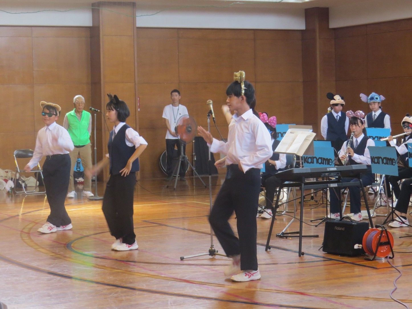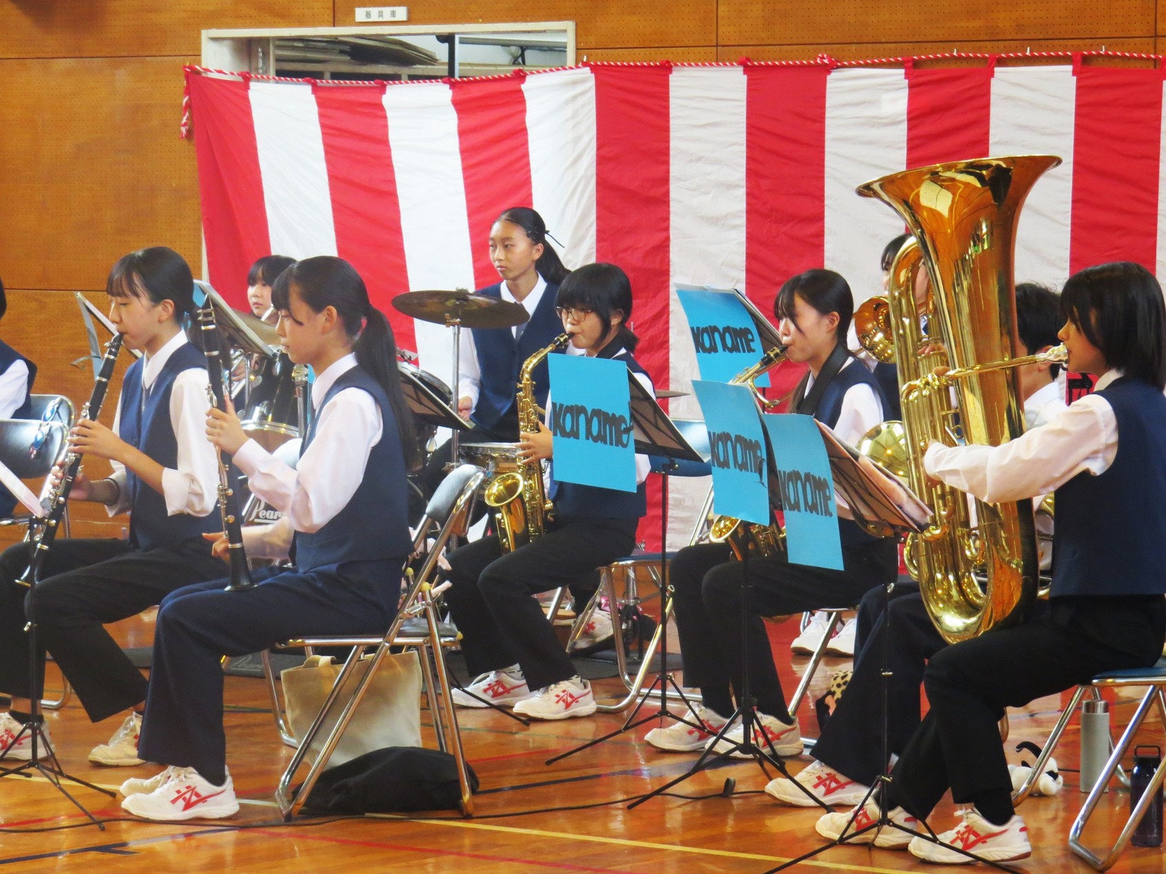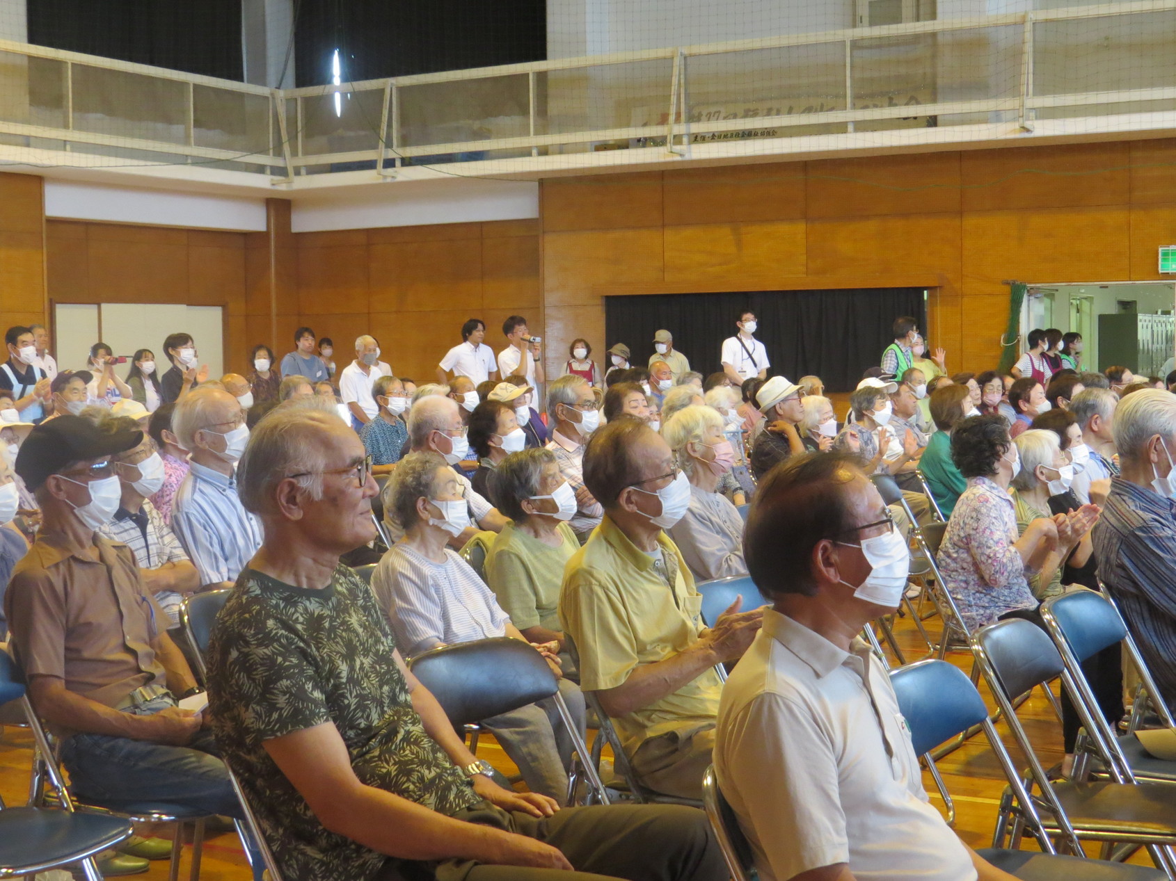 「敬老の集い」が開催されました! 金目社会福祉協議会を金目の5団体共催の「敬老の集い」が10月1日午前10時から金目公民館体育館で開催されました。 この敬老の集いは金目地区に住む77歳以上(昭和21年10月1日以前生まれ)の方を対象に行われ、紅白饅頭と、赤飯またはカレーセットが400人の出席者にお祝い品とが配られました。 また10時30分から体育館で開催された式典と地域の方による演芸発表があり、出席者の半数がこれに参加しました。 式典では主催者の森口明男金目社会福祉協議会会長、共催者の平井保二郎金目長寿会会長、秋山博金目自治連会長の挨拶がありました。また演芸発表では 金目中学校吹奏楽部の演奏、レクレーション演技、みんなで歌おう が11時30分過ぎまで行われ楽しい一時を過ごすことが出来ました。 上下の写真はその時の様子です。(Y.Y) |