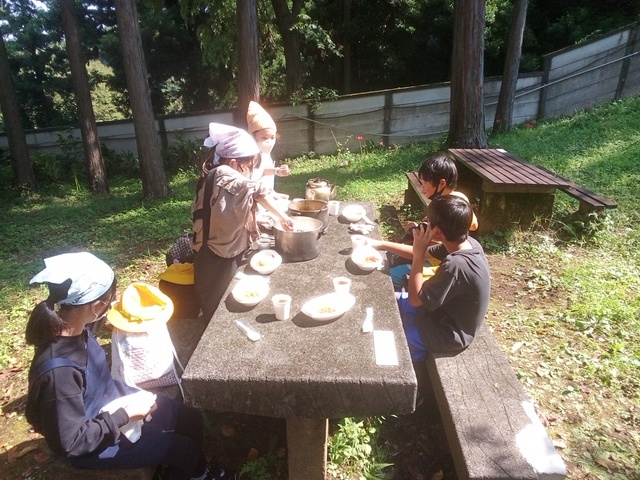 美味しいカレーができました! 「にんじんがちょっと硬かったかな」「ご飯がごげてるよ〜」などと言いながら、グループごとに楽しく会食しました。 このあとは片付けをして、コテージに入室していきます。 | |