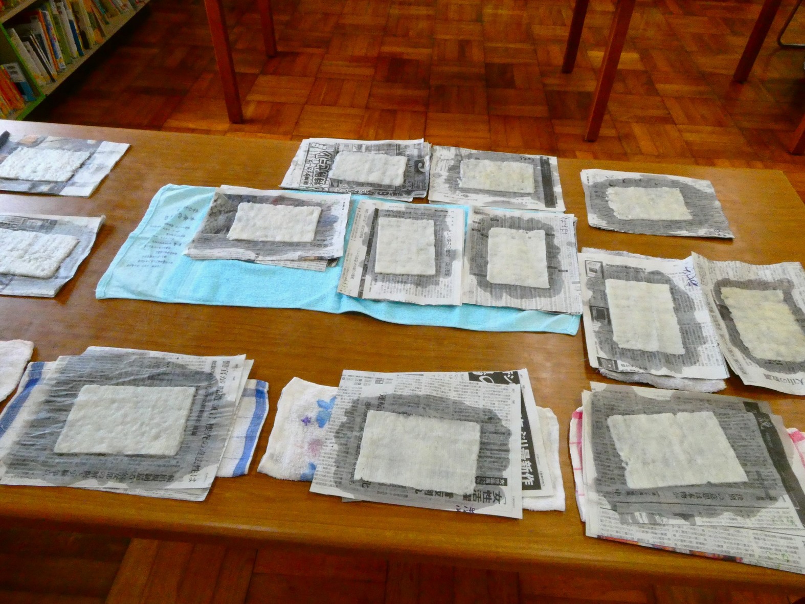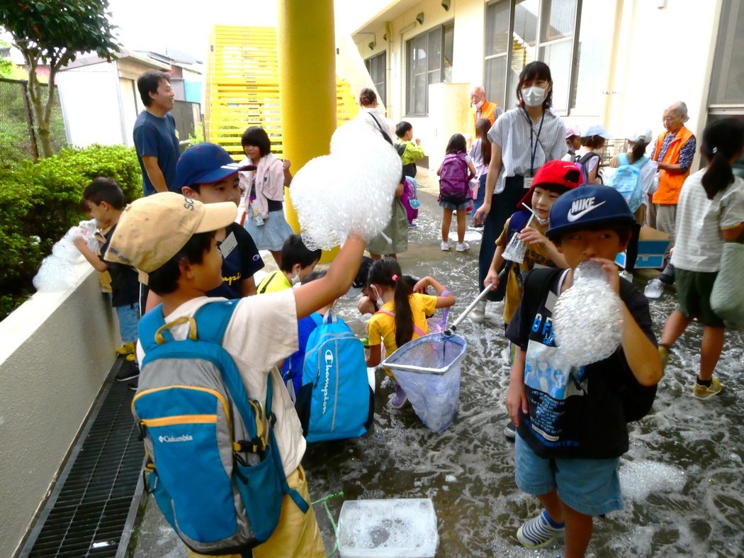 金目エコ 「コスモスまつり」に協力 金目公民館と金目中学校区地域教育力ネットワーク協議会の共催事業である「コスモスまつり」に金目小・みずほ小の児童46名が参加して、9月23日(土)に開催されました。金目エコミュージアムは「コスモスまつり」共催団体から科学実験のお手伝いの要請を受けて、全児童を対象に花びら、バナナ、ゴム風船などを使った液体窒素の「-196℃の超低温の世界」を体験させました。 更に1年生から3年生の低学年には家庭にあるプラスチックのコップ、ペットボトル、魚とり網を用いて大小、葡萄状シャボン玉を作って飛ばしました。 また、4年生以上の高学年は稲わらでつくったパルプを紙漉きしてハガキ大のわら紙を作りました。初めて経験する不思議な楽しい科学体験が出来たかと思います。(Y.Y) 稲わらの紙漉きをする高学年生 漉いた紙を並べて乾燥 | |