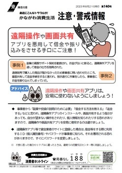 アプリ悪用手口に注意 遠隔操作や画面共有アプリで借金や振り込みをさせられた等の相談が寄せられています。望まない操作や、個人情報を知られる恐れがあるので、こうしたアプリを安易に使わないようにしましょう。 詳細は以下のPDFをご覧ください。 |