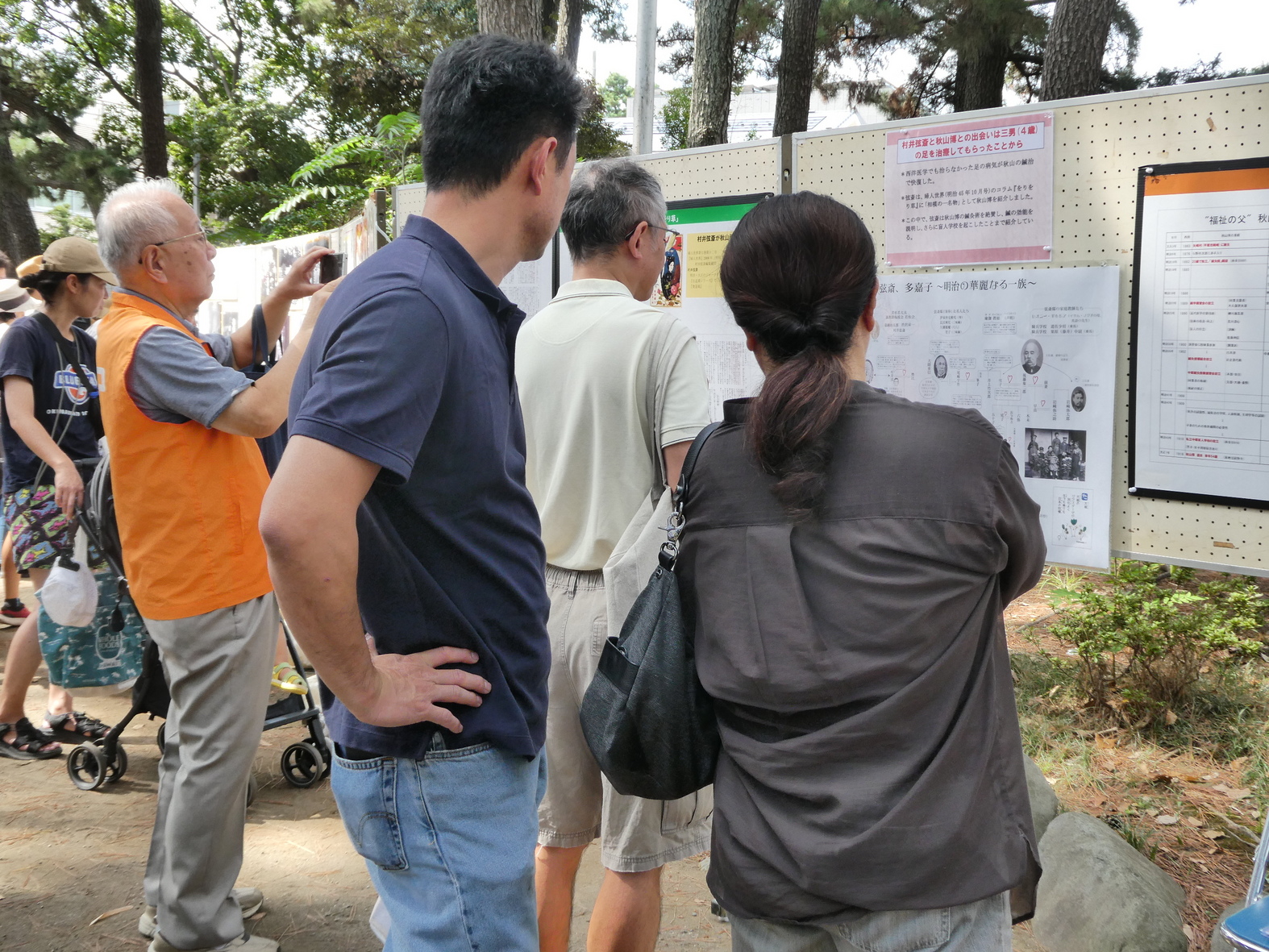 金目エコが村井弦斎まつりでパネル展示 9月28日(日)平塚駅南口の村井弦斎公園で第24回「村井弦斎まつり」が開催されました。 村井弦斎(1864〜1927)は、明治後期から昭和の初め頃にかけて平塚市に居を構えたジャーナリスト、小説家。代表作の小説「食道楽」は大ベストセラーになりました。「金目の鍼灸医さん」として全国的に知られ、私立中郡盲人学校(現県立平塚盲学校)を開校した秋山博(1863〜1918)をまさに全国的に知らしめた人が村井弦斎です。彼の三男(4歳)を治療してその効能(功能)を随筆「をりをり草」(婦人世界・明治10月秋増刊号)で絶賛しました。 金目エコでは、毎年春分の日に「秋山博頌徳祭」を開催していますが、秋山博と村井弦斎との接点を知った2年前から、「秋山博頌徳祭」では村井弦斎を紹介し、「村井弦斎まつり」では秋山博の展示パネルを行い親交を深めています。 (T.K.) なお、弦斎まつりの様子はSCN(湘南ケーブルネットワーク)「湘南カフェ!湘南館ワイド」で放映されます。 |