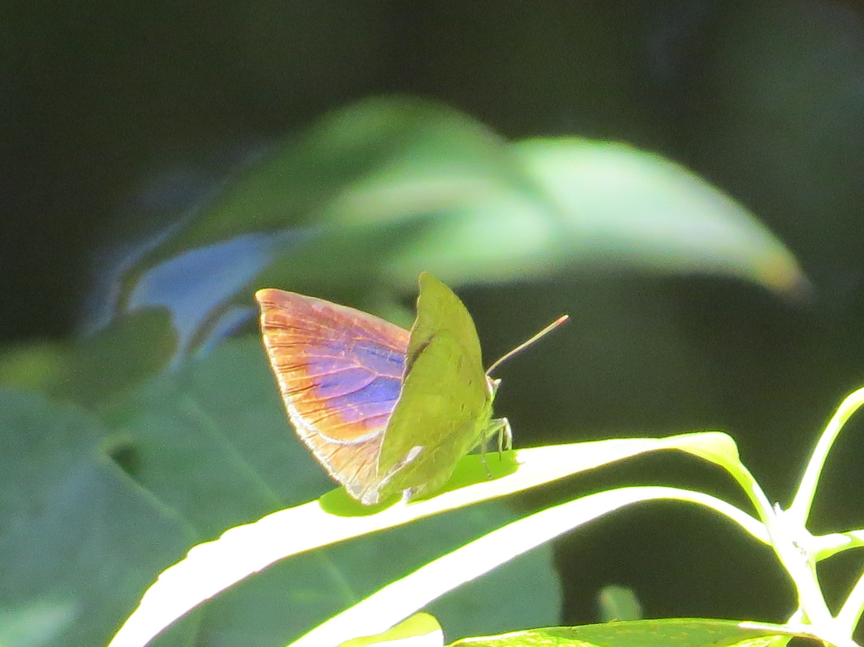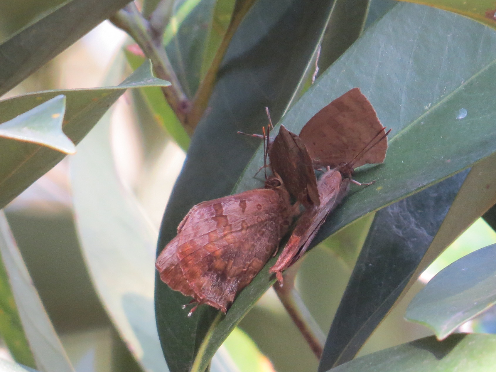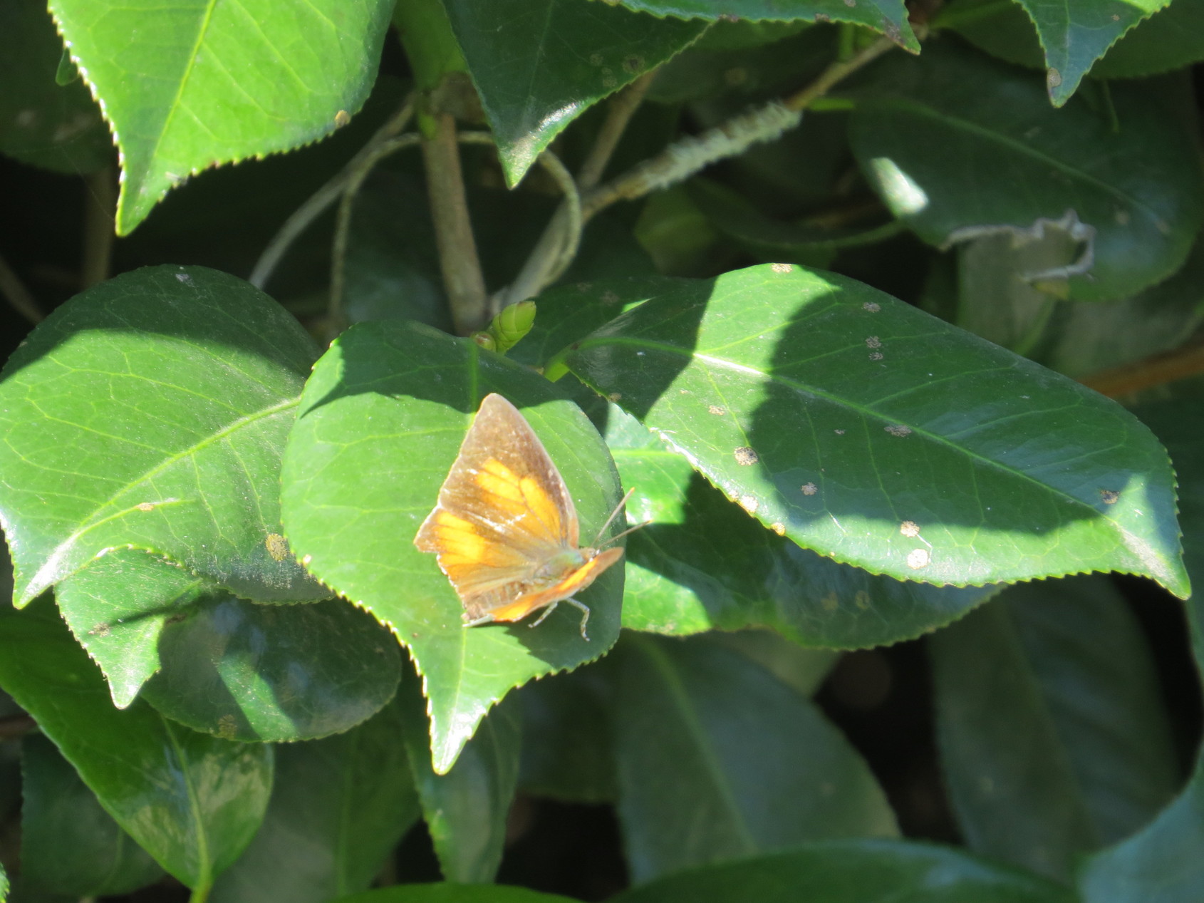 園内で冬眠・休眠して越冬するシジミチョウを探してみませんか! 11月10日に民家の生け垣の葉の裏で冬眠に入っているウラギンシジミを今季初めて発見し、かなめ域情報局に報告しました。翌日11日の天候は朝から曇って肌寒い日となりました。このような寒い日ならば、金目親水公園でもウラギンシジミの冬眠中の姿が見られるのでと思い園内を探し回りました。 その結果、公園池の東側にある大きなアラカシの葉裏に2頭がそれぞれ別の場所で冬眠していました。(上写真2枚) さらに、これから先、晴れた温かい日にはムラサキツバメ、ムラサキツバメといったシジミチョウが葉っぱの上で羽を広げて日向ぼっこしたり、また曇った寒い日には雨のかからない葉っぱの上で集団越冬している様子も観察されます。 成虫で冬眠や休眠して冬を越す蝶に関心のあり方は、ぜひ、園内を散歩しながら探してみませんか。(ふぁいあ ふらい) 探し方: 越冬しているウラギンシジミを探すときは、背丈より高い位置の葉っぱの裏側を、またムラサキシジミとムラサキツバメの日向ぼっこおよび越冬している姿(下写真参照)を探すときは葉っぱの上を探してみてください。なお、見上げながら探し歩くため、足元の地面の様子がわかりません。足元には十分気を付けてください。 参考資料: 左から➀ムラサキシジミ日向ぼっこ(R3.12.8)、Aムラサキツバメ日向ぼっこ(R5.11.16)、Bムラサキツバメとムラサキツバメの異種間集団越冬(H30.12.19) いずれも金目親水公園にて撮影 | |