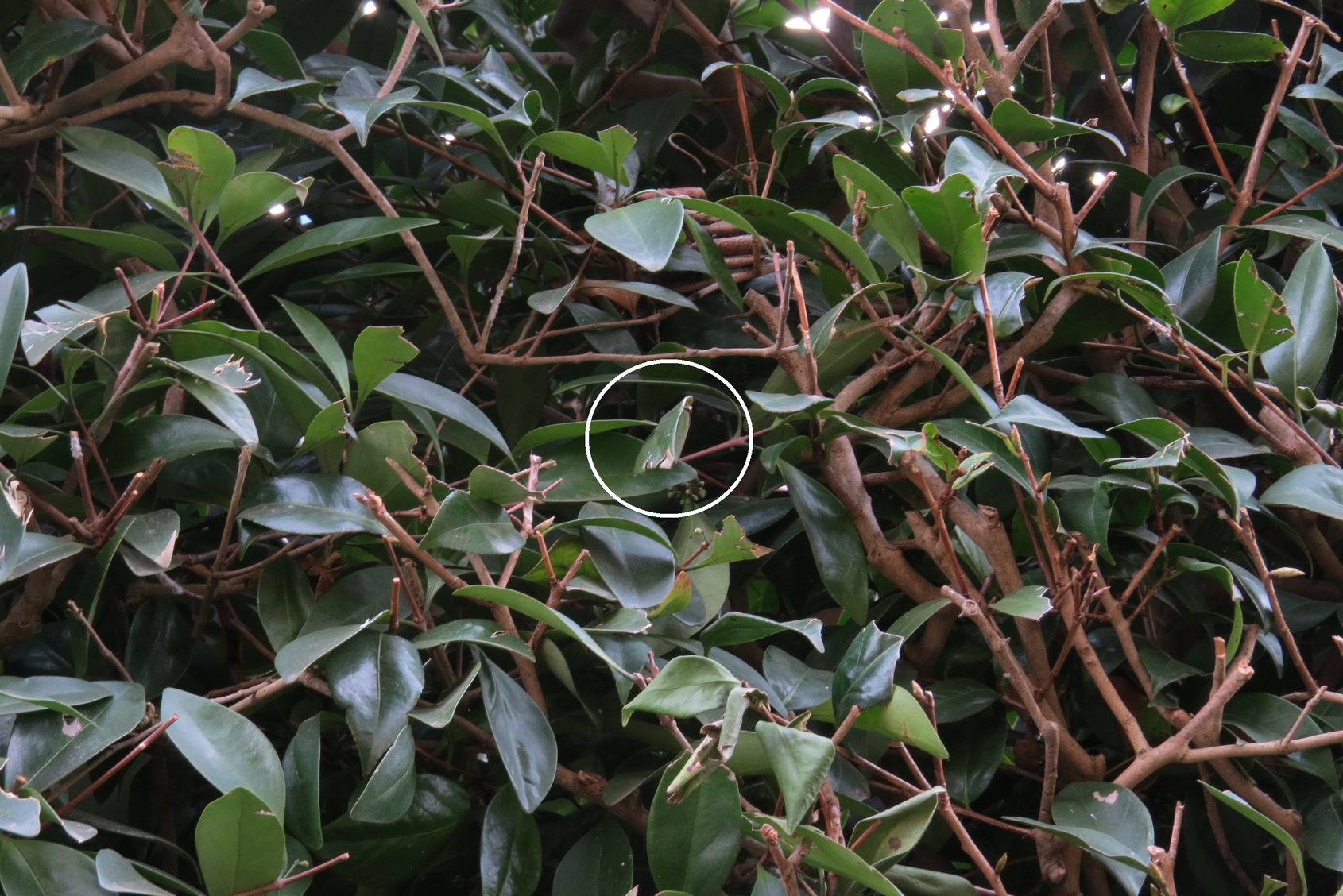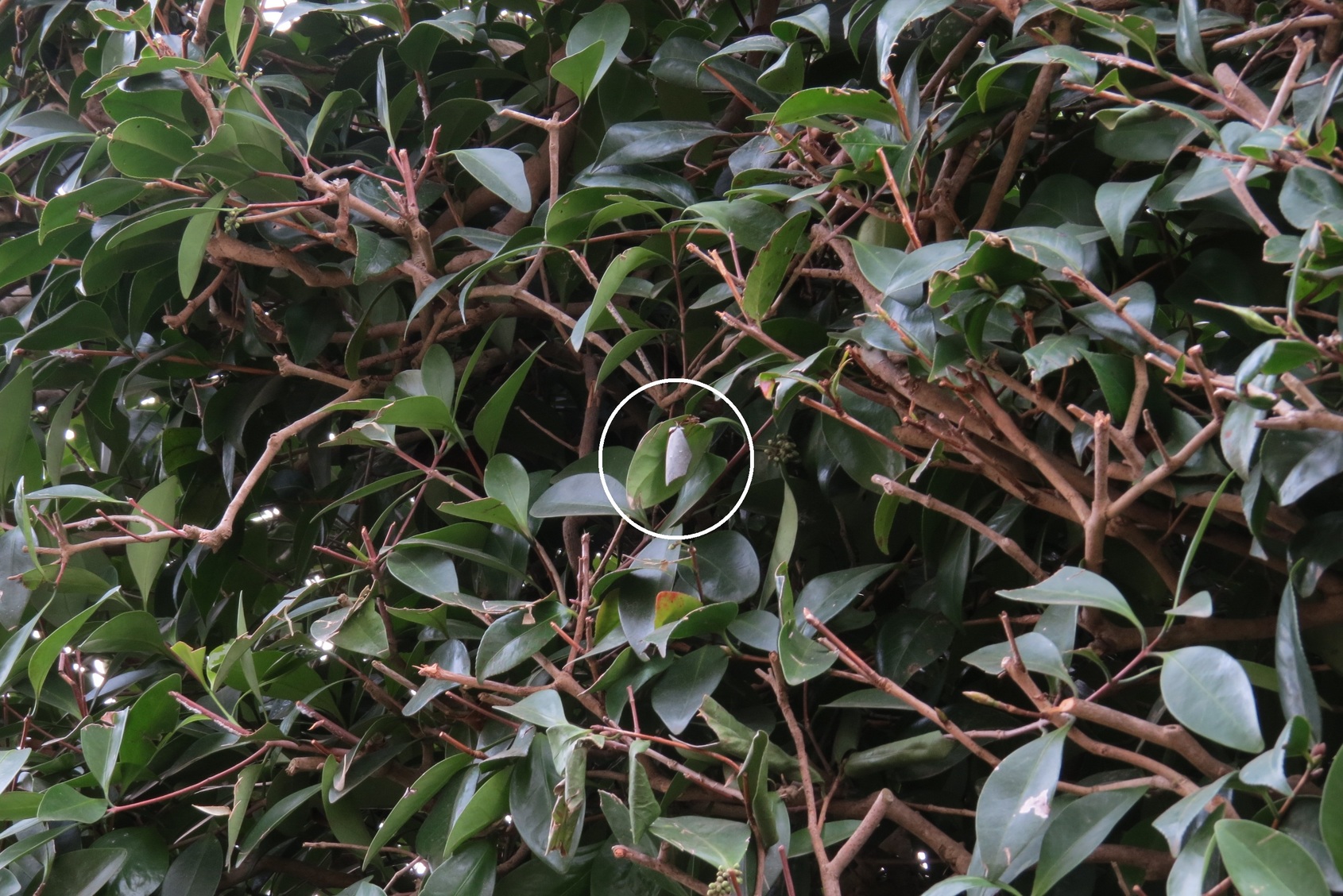 ≪金目の自然 蝶≫ ウラギンシジミの葉隠れの術 ウラギンシジミは、11月頃から翌年の3月中旬頃までの約4ヶ月間を上をの写真のように広葉常緑樹の葉の裏にとまって人知れずに越冬します。このウラギンシジミが冬眠している姿を発見し、その場所を十分に確認した後でも数日後に改めて探しに行くと、簡単に探し出せないことが往々にあります。この事はウラギンシジミが上手な葉隠れの術を持っているからです。 今回はこのウラギンシジミの葉隠れの術を写真で紹介します。 上の左端写真は上写真のウラギンシジミ(円内)を右斜め下から撮ったものです。この位置からでは蝶の存在を知る人は兎も角、関心のない人は全く気づかずに通り過ぎて行きます。 また中写真は閉じた翅をほぼ正面下から撮ったものです。この位置からでは蝶全体が細い線状に見えるので、この場所に居ることを既に知っている人でもなかなか探し出せません。 更に右端写真は左下から撮ったもので、完全に葉っぱに遮られて蝶の存在すら分かりません。 越冬中のウラギンシジミを初めて探そうとすると左から右へ、右から左へと何度も往復しながら探さねば見つかりません。ぜひ、越冬中の蝶を探してみませんか。結構、散歩以上にエネルギーが必要かもしれません。 なお、1月26日現在、親水公園内、及びその周辺での冬眠中のウラギンシジミはこの写真の蝶しか確認されていません。(Y.Y.) |