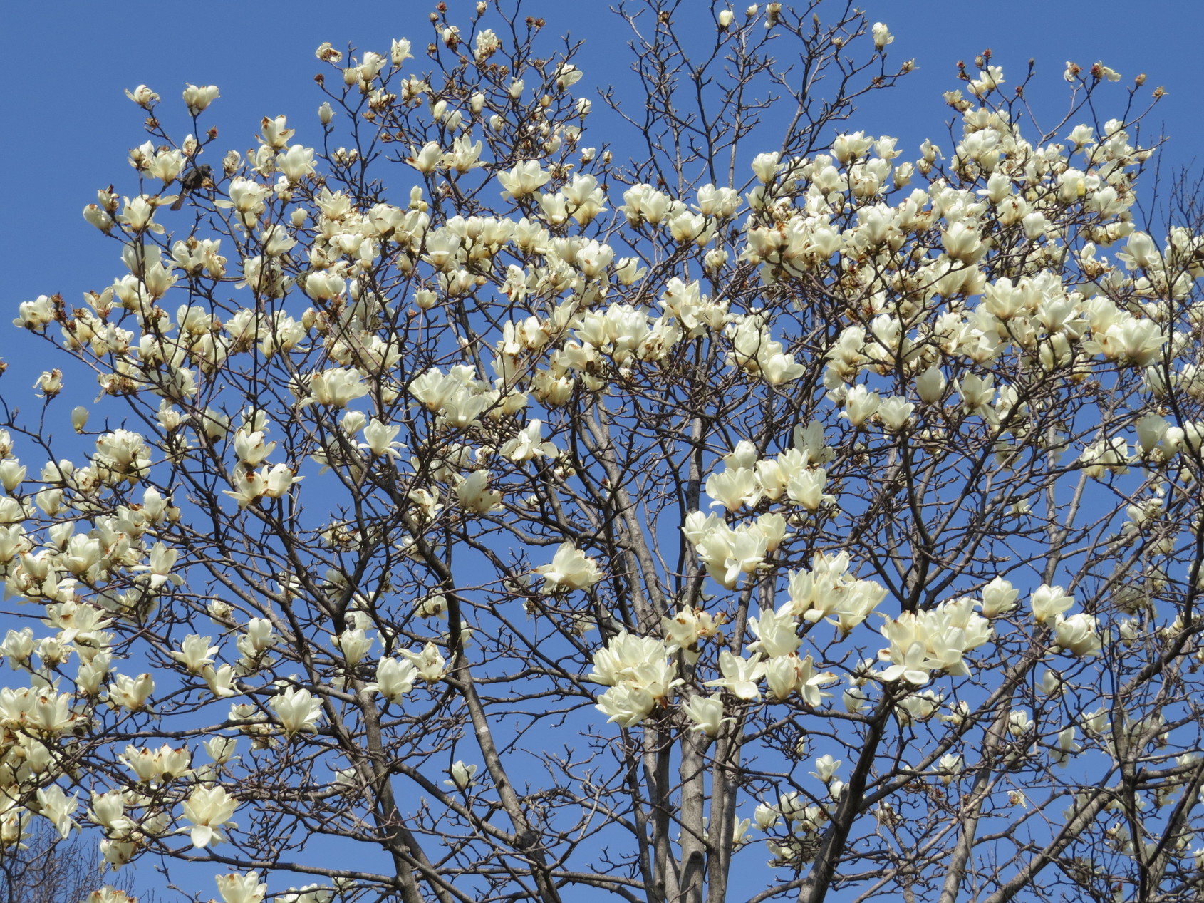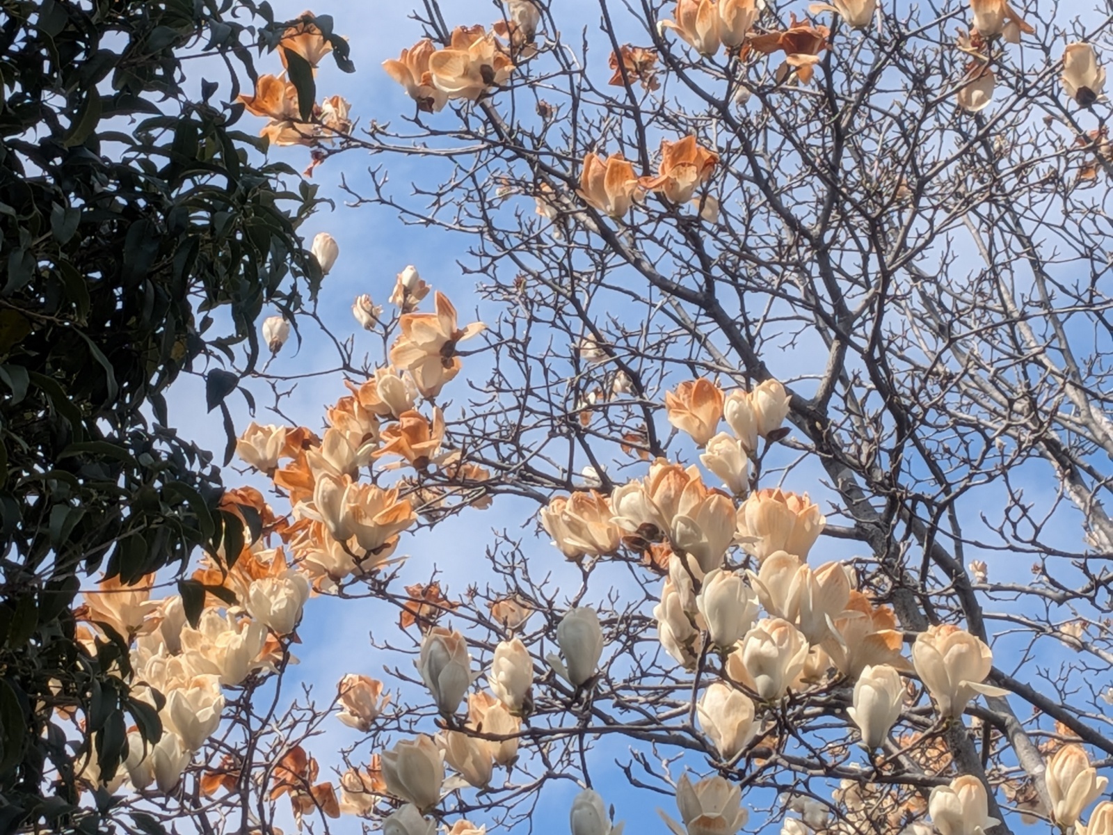 ≪ 金目の自然 ≫ 寒さで花びらが霜焼けに! 今年の3月の気候は例年に比べて異常の寒暖の差が激しいようです。というのは3月になって1日、2,4,7日は日平均気温が12〜13℃と春を思わせる陽気となりました。ところが、8日から本日まで日平均気温は5℃〜8℃と10℃以下となり、またこ期間の最低気温がー0.2℃の日もありました。この寒暖差の影響をまともに影響を受けた植物があります。3月初めの春の陽気に開花したハクモクレン(左写真3月1日撮影)は、8日以降の低温度に晒されて花びらが霜焼けして褐色に変色してしまいました(中写真、右写真 3月11日撮影)。 例年のこの時期では、下写真(R6.3.15 撮影)のように花びらが1枚ずつ落ちるまで白色で、落ちて枯れて褐色になります。 |