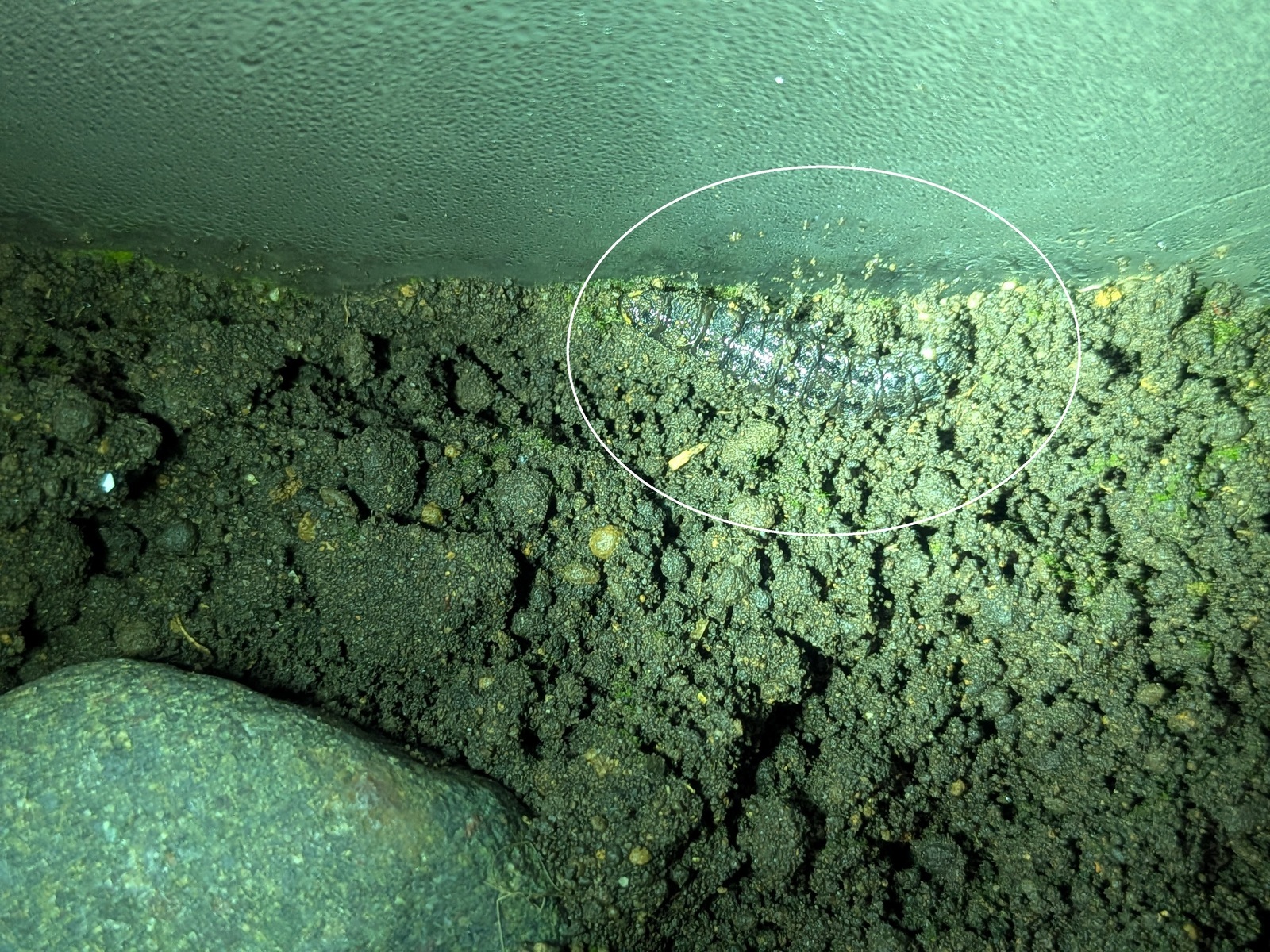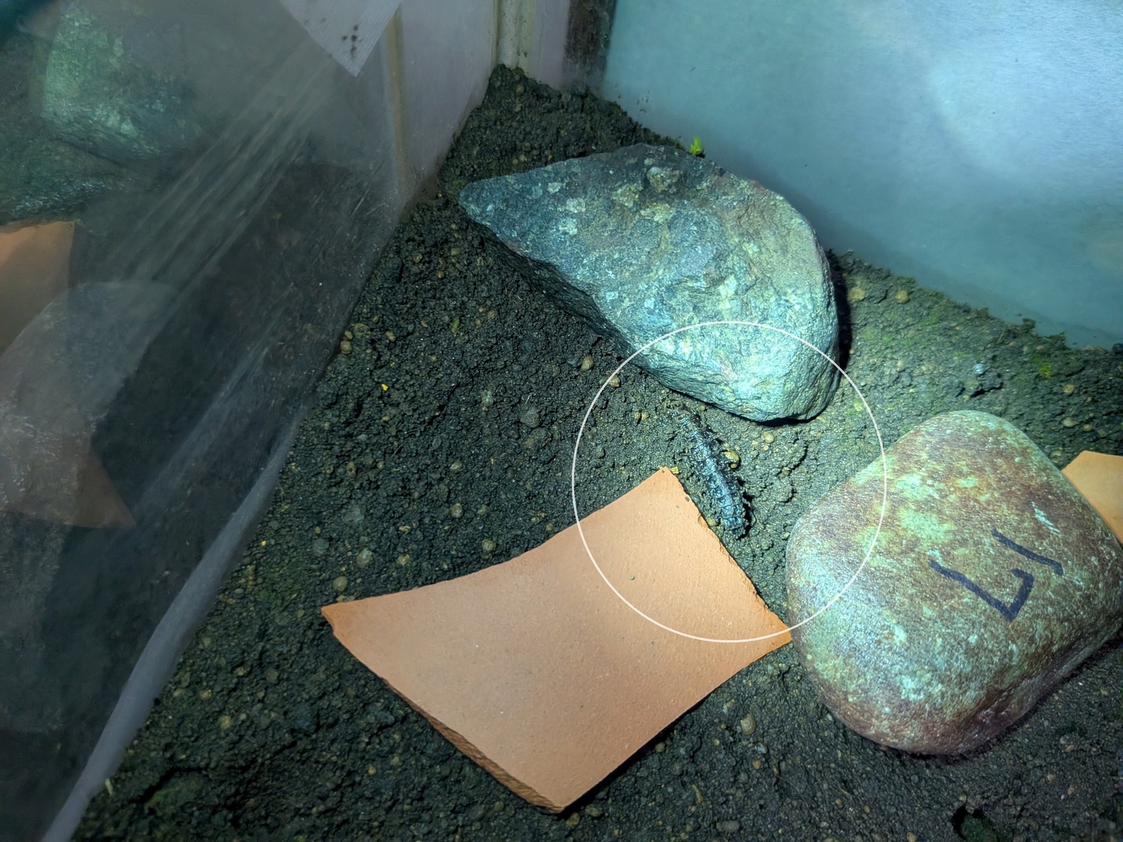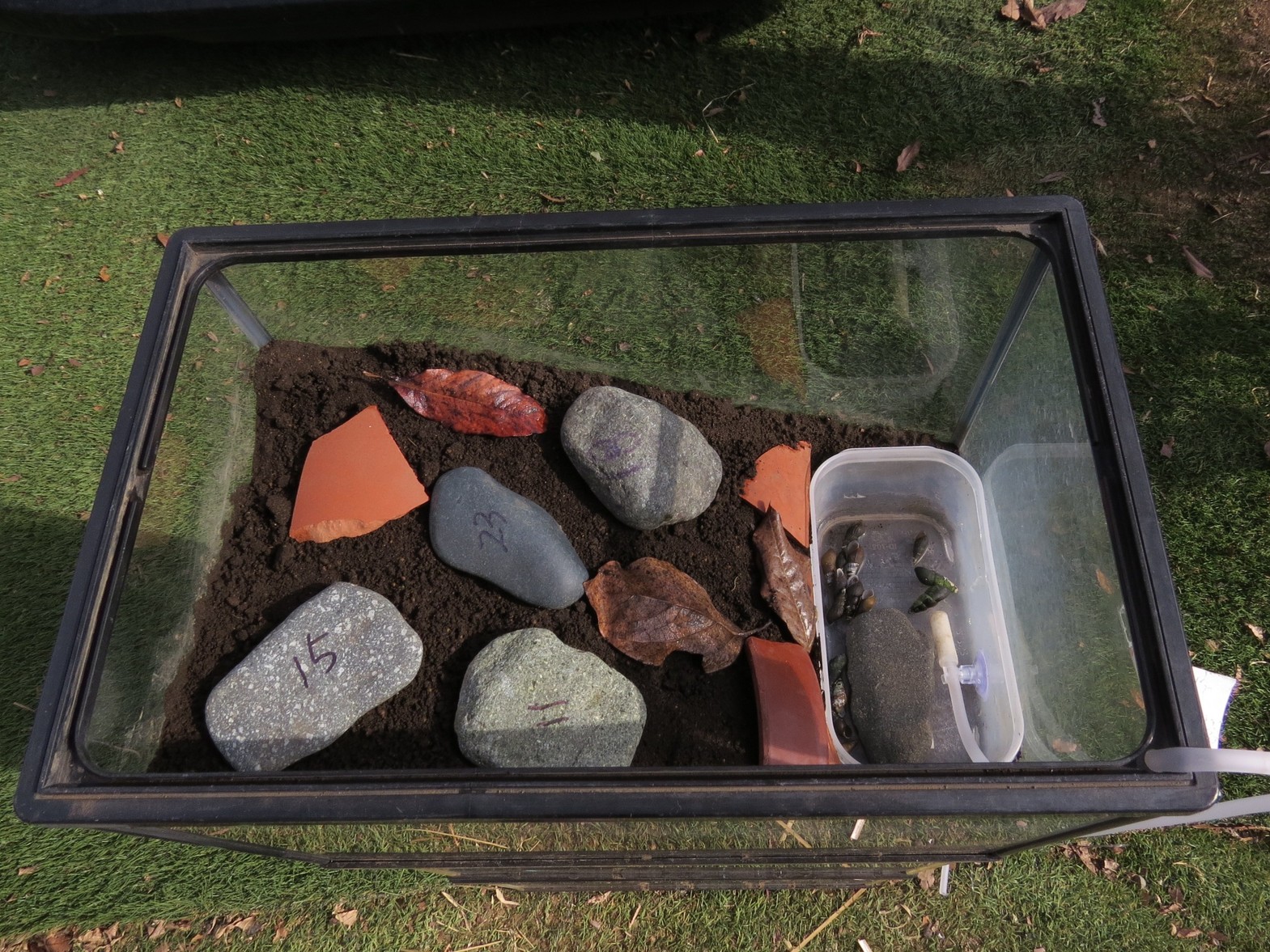 室内飼育のホタル幼虫も上陸し始めました! 2月11日と13日に親水公園ホタル水路に放流したゲンジボタルは3月9日に上陸し始めたことを報告した。種ボタルの獲得ために室内の上陸用容器(下写真)に移したホタル幼虫がやっと3月25日に水槽から這い上がり、土まゆを作るために石や鉢欠けの周辺を這い回っている姿が確認(左写真)されました。 尚、この日の22時05分時の気象状況は以下の通りでした。天候:雨 室温:16℃ 水温:14℃ 地温:14.8℃ 湿度:72% (ふぁいあ ふらい) |