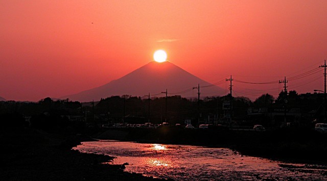 ダイヤモンド富士が鑑賞できる1週間 ダイヤモンド富士とは、富士山の頂上に太陽がちょうど沈む瞬間の輝きをダイヤモンドに例えたものです。沈む太陽の輝きが富士山々頂の起伏で散乱する様がこの世とは思えない荘厳な美しさに見えます。光明寺山門前、田子嶺の富士景観地、若宮橋の中央など数多くの富士景観地で眺めるダイヤモンド富士は「金目の宝」そのものと言えましょう。 当日の天気と運がよければ、下記の場所、時間で見られます。(T.E.)