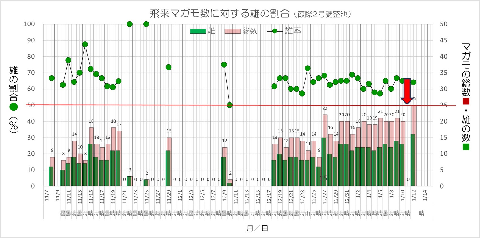 - 2026/01/06 葭際2調整池への飛来するコガモの数と雌雄の割合