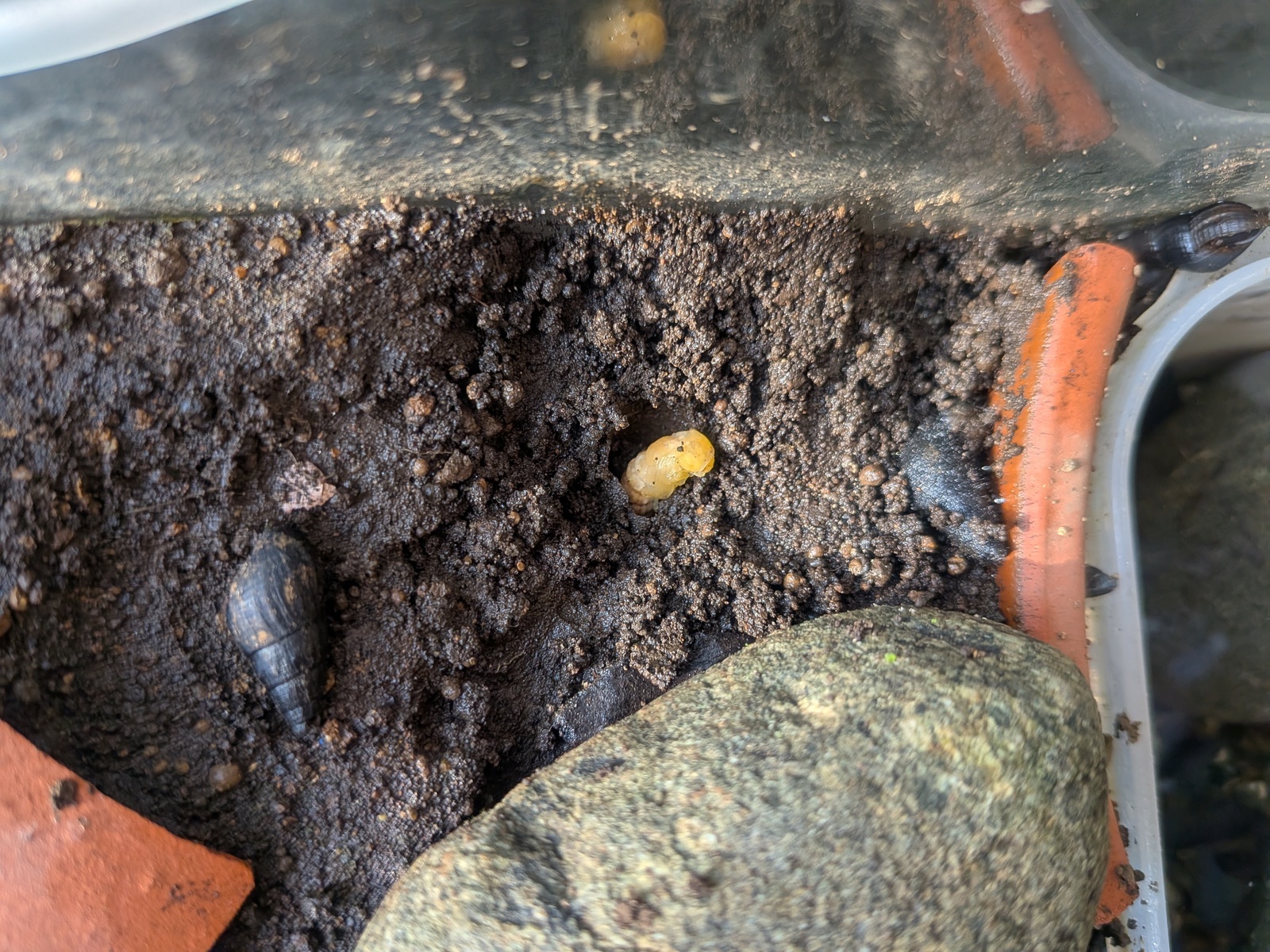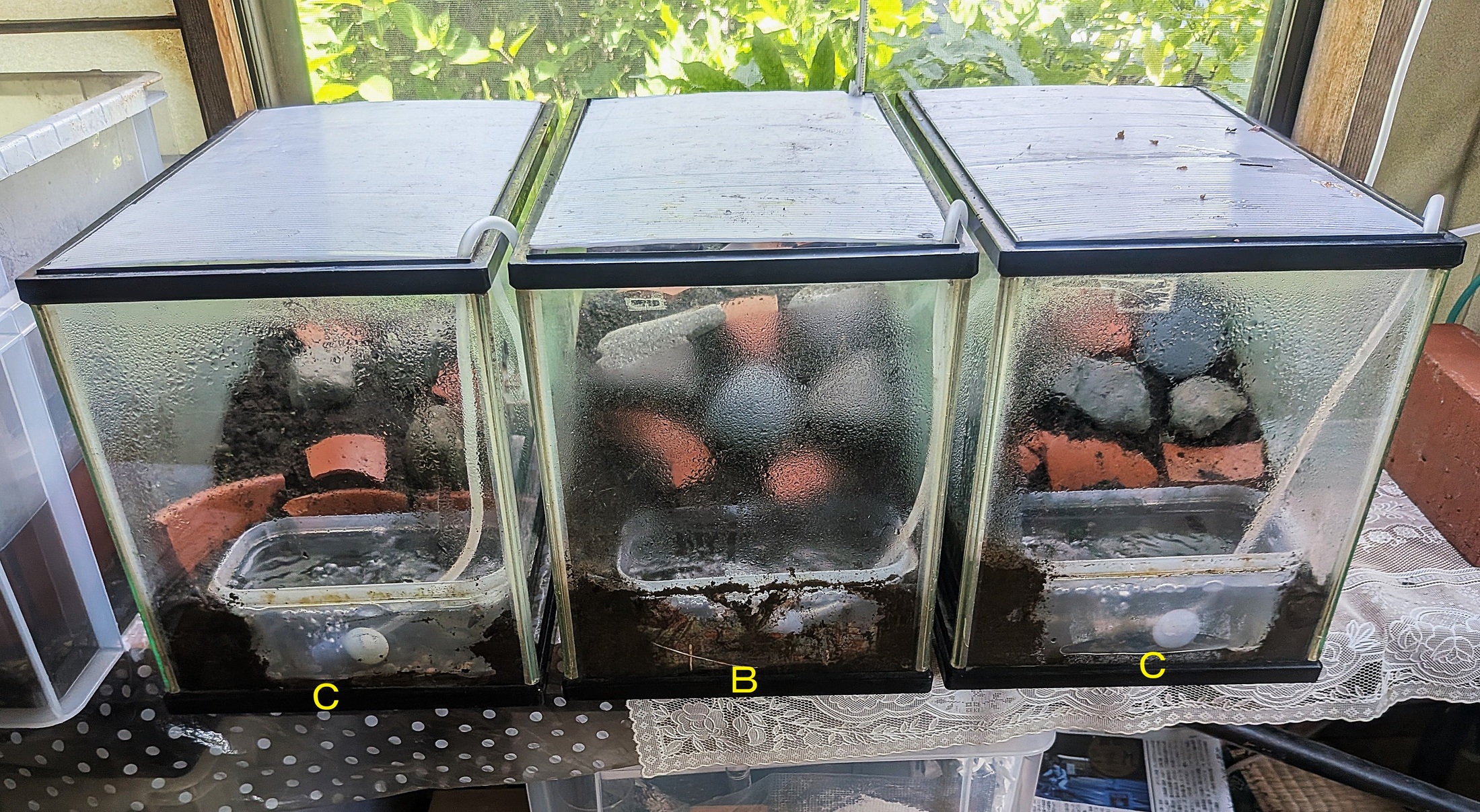 令和8年 ゲンジボタル室内上陸調査から 令和7年6月に羽化したばかりの1齢幼虫を終齢幼虫まで育て、翌年(令和8年)の2月に金目親水公園ホタル水路に放流した。その残りの幼虫(57匹)を2月14日に3つの上陸用容器(左写真)それぞれ19匹ずつ移して、ゲンジボタルの室内上陸調査を試みた。調査は20:00〜20:30における天候、上陸容器が置かれている室内の室温と湿度、上陸容器内の水温、地温、更に調査時の各容器内で目視された上陸幼虫数(右写真)である。 【調査結果1】 上陸は上陸容器に移動(放流)して39日目の3月25日から始まり、上陸初期を除き、ほぼ毎日16日間続いた。またその間の気温、水温、地温はそれぞれ16℃、14℃、15℃以上で、湿度70%前後の日が多く上陸した。 【調査結果2】 各容器での幼虫上陸の調査結果をまとめたのが表1である。