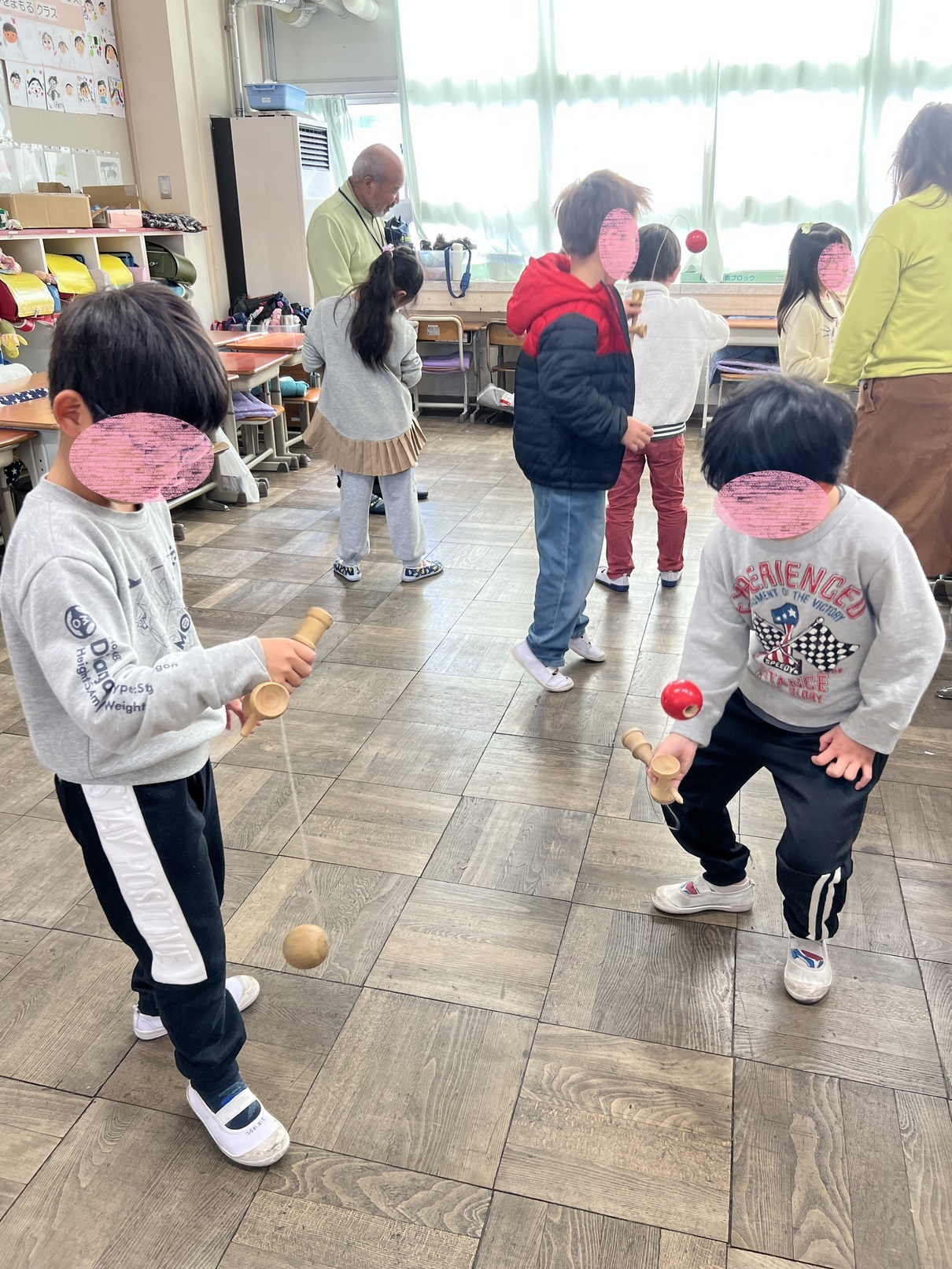 金目エコ、金目小学校1年生と昔遊びで交流 12月18日(木)、金目エコミュージアムのメンバーが金目小学校を訪れ、1年生(40名)と校時4・5時間目(11:05〜12:30)に「昔遊び」を通した交流を行いました。 当日は、お手玉、けん玉、だるま落とし、こま回しの4種類の昔遊びを体験。エコメンバー8人は各遊びの場に2人ずつ分かれて付き、そこへローテーションしてくる子どもたちと一緒に遊びながら、遊び方のコツや自身の体験などを伝えました。 初めて挑戦する遊びも多く、難しさを感じながらも子どもたちは「どうしたらできるかな」と工夫し、何度も挑戦する姿が見られました。できた瞬間には笑顔で「できた!」と声をあげ、昔遊びの楽しさを実感している様子でした。(A.M. ) |
