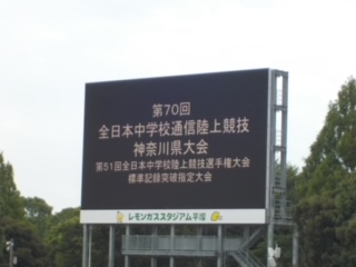 本日は、レモンガススタジアム平塚において、第70回全日本中学校通信陸上競技神奈川県大会が行われました。本校からは110mハードルに3年田中さんが出場しました。写真の8レーンが田中さんです。予選7組5位の成績で、残念ながら決勝には進めませんでしたが、県大会で立派に健闘しました。 | ||