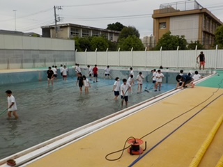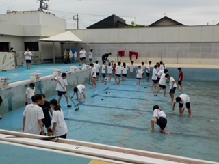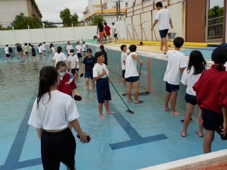 放課後に体育委員とボランティアによるプール清掃が行われました。本日は30度を超える真夏日で、朝からとても暑い一日でしたので、冷たい水が気持ち良さそうでした。校務作業員の森さんが水の量を調整しながら、あらかじめプールの中の大きなゴミを取り除いてくれていたのですが、プールサイドも含めて汚れがかなりこびりついていました。1時間ほど、たわしやデッキブラシで一生懸命にこすって、だいぶきれいになりました。みんなビショビショでしたが、達成感はあったようです。きれいになったプールでの1・2年生の水泳の授業は、7月1日(月)より開始します。 | ||