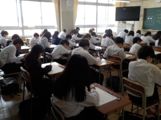 写真は、1学期中間テスト2日目2校時の様子です。 1年生にとっては初めての定期テストで、放送で流れる英語のリスニング問題に集中して取り組んでいるところです。5教科のテスト終了後には、いじめに関するアンケートを実施しました。 金旭中学校では、添付ファイルのとおり「いじめ防止基本方針」を定めています。すべての生徒がいじめを行わず、ほかの生徒に対して行われるいじめを認識しながら放置することがないよう、また、本校の生徒を取り巻くすべての大人が連携・協力して、いじめの防止に取り組むことを目指して、この方針を定めました。保護者や地域の皆様と連携し、「未然防止」を基本に「早期発見・早期対応」に努めてまいります。気になる様子等ありましたら、すぐに学校までお知らせください。 | |