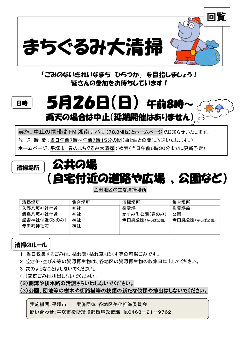 金田地区は、平塚市のほぼ中心部に位置し、地区の東西に鈴川と金目川が流れており、中央に東海道新幹線が東西に走っています。人口は約1万人で、飯島、寺田縄、入野、長持、長瀬の5つの単位自治会で構成されています。