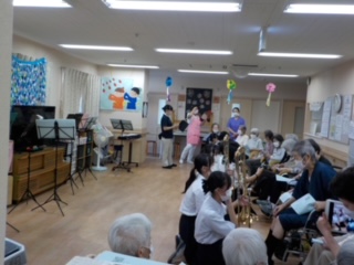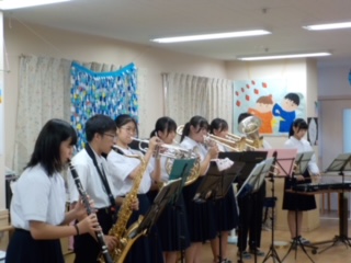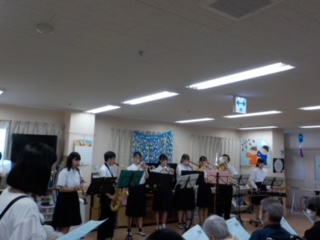 本日は、吹奏楽部3年生8名が、エクセレント湘南平塚 看護小規模多機能型居宅介護施設訪問演奏に伺いました。最初は緊張しながら、一人ずつ自己紹介をして、楽器の紹介と演奏をしました。そのあと「夏の思い出」を利用者の方たちといっしょに歌い、「川の流れのように」を演奏して曲に合わせて歌っていただきました。アンコールで「学園天国」を演奏してから、楽器を見ていただいたり、さわっていただいたりして、お話をする時間をいただきました。あっという間に時間が過ぎてしまい、もう一度「夏の思い出」をいっしょに歌って終わりのあいさつをしましたが、名残惜しく、もう1曲、音楽の授業で歌っている「花」をいっしょに歌って終わりました。利用者の方たち皆さんが、最初からとてもうれしそうな表情をされていて、生徒たちもすぐに打ち解けて、温かく素敵な時間が流れていました。地域にある施設でこのような機会をいただけたことに感謝しています。 |