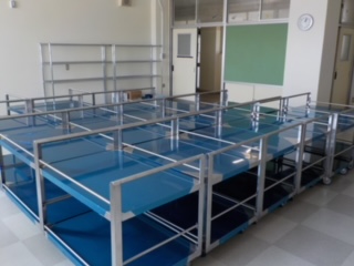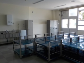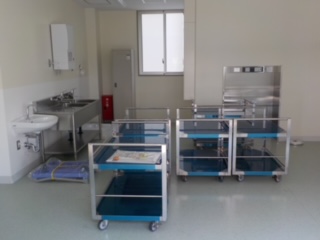 本日、給食センタースタッフ1名と配膳員4名の方が、学校を訪問されました。夏休み中に配膳ワゴンやラック、配膳台などが運び込まれ、いよいよ給食が始まることを実感しています。 今後、配膳員さんによる配膳トレーニングと配送員さんの配送車による配送トレーニングを行い、27日には実際の給食が入ったものを使った最終確認をして、受け入れ室の清掃を実施し、9月2日の給食開始を待ちます。献立表はすでに配布しましたが、初日の献立は、ポークカレーとベジ太のサラダ、ぶどうゼリーです。 | ||