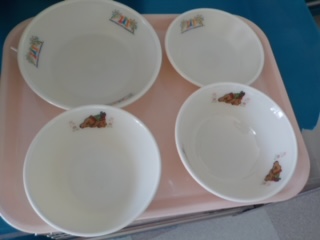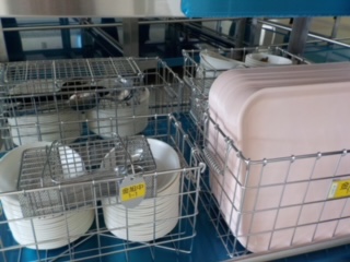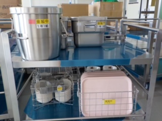 本日は、配膳員さん4名が出勤して、給食の配膳トレーニングを実施しました。配送車でコンテナ、食器、食缶、トレー、食具等が運ばれ、配送車からのコンテナ積み下ろし→コンテナから配膳ワゴンへの移し替え→小荷物昇降機での上げ下げ、下膳・コンテナへの戻し→トラックへの積み込みの一連作業を確認することになっていました。実際には、さまざまなトラブルが発生し、順調にはできませんでした。また19日からトレーニングが続き、給食開始に間に合うように調整していきます。コンテナ以外の写真の1セットが学校に置いてあるので、学校の職員もいつでも確認することができるようになっています。写真のように、配送車と食器には平塚産農産物PRキャラクターのベジ太がいますので、すぐにわかります。 | ||