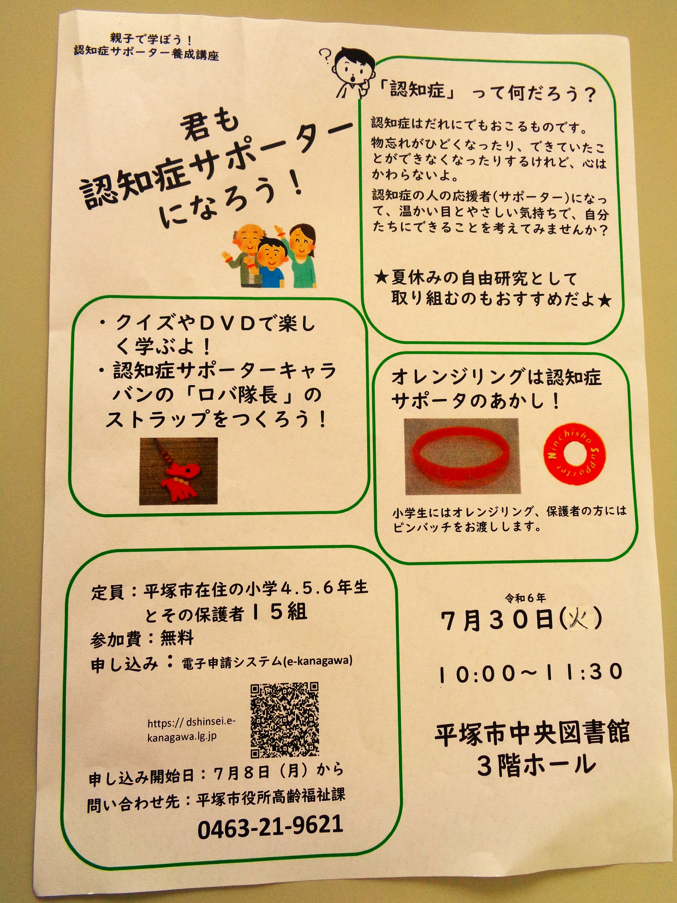 こんにちは😊 平塚市で「親子で学ぼう!認知症サポーター養成講座」を開催します! 日 時:令和6年7月30日(火)10:00〜11:30 場 所:平塚市中央図書館3階ホール 対象者:平塚市在住の小学4・5・6年生とその保護者15組 内容:「認知症」ってなんだろう? ※クイズやDVDで楽しく学べます ※認知症サポーターマスコットキャラクター 「ロバ隊長」のストラップづくり ※受講者にはオレンジリング、保護者にはピンバッジをお渡しします。 参加費:無料 申込開始日:7月8日(月)から 問い合わせ:平塚市役所 高齢福祉課 0463−21−9621 ★夏休みの自由研究として取り組むのもおすすめです |