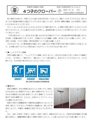 - 2025/09/22 令和7年度 地域版 南原小学校だより「4つ子のクローバーvol5」をお届けします。