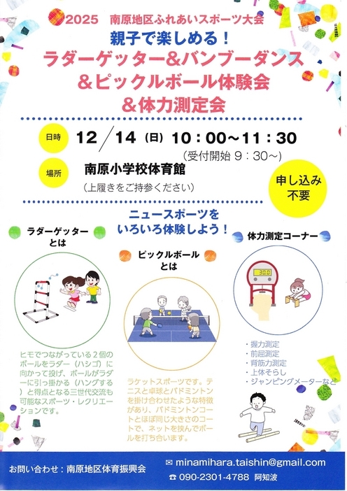 体育振興会です 下記日時に「南原地区ふれあいスポーツ大会・ラダーゲッター&バンブーダンス&ピックルボール体験会&体力測定会」を開催します どなたでも参加できます。上履きをご持参のうえ、南原小学校体育館にお越しください 日時:2025年12月14日(日) 9:30受付開始 場所:南原小学校体育館 持ち物:体育館履き、動きやすい服装でお越しください |