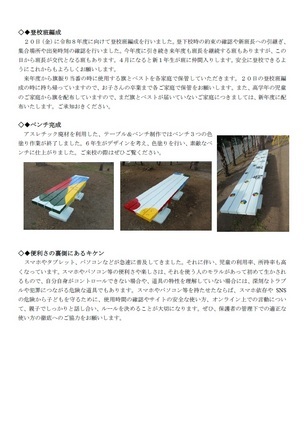 「みんなの手でよみがえるテーブル&ベンチープロジェクト」を開催します。 みんなで、協力して作りましょう。 日時:2025年11月22日(※雨天時は11月29日) 10:00〜11:30 場所:プレハブ会議室に集合してください。 持ち物:タオル、45ℓポリ袋、ビニル手袋 |