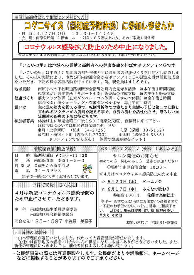 南原公民館だより令和2年4月号でお知らせした以下の事業については中止になりましたのでお知らせします。