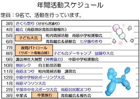 代表 尾島 悟 《会員人数》 現役 20名 + OB 若干名 《目的》 小学校のPTA活動のサポート及び各地域行事のお手伝いをしています。 《活動内容》 ・運動会の準備(テント設営等) ・こども大会のサポート(付添い) ・デイキャンプの手伝い(花火打上げ等) ・盆踊り大会での出店(とうもろこし・パイナップル販売) ・諏訪神社例祭での子ども神輿サポート ・南原まつりでの出店の手伝い ・公民会まつりでの出店(チョコバナナ・フライドポテト販売) ・さくら祭りでの出店(チョコバナナ・フライドポテト販売) ・小学校のペイントボランティア(ペンキ塗り) |