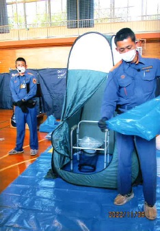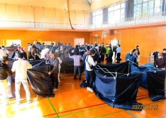場所:港小学校体育館 当日は、10時より開会セレモニー、港自治連陶山会長の開会あいさつ、市災害対策課担当職員より訓練内容についての説明のあと、当日参加された港小学校輿石教頭、港小学校市配備職員5名の紹介がありました。 引き続き、10時15分より当日の訓練スケジュールに従い、訓練資機材の準備の後、避難所用仕切りテント、災害対策用プライベートルーム(屋根付き)などの組み立て方及び収納の仕方、次に段ボール箱を使用した簡易ベッドや防災用トイレ(ユニトイレ)の組み立て方、傷病者の搬送訓練、避難所レイアウト作成訓練(配備訓練)があり、最後に市担当職員がまとめのあいさつをして締めくくり、12時頃、無事訓練を終了しました。 当日の参加者は、港地区合計で86名でしたが、お互いに連携を図りながら比較的スムーズに進行され、有意義な訓練でした。 |