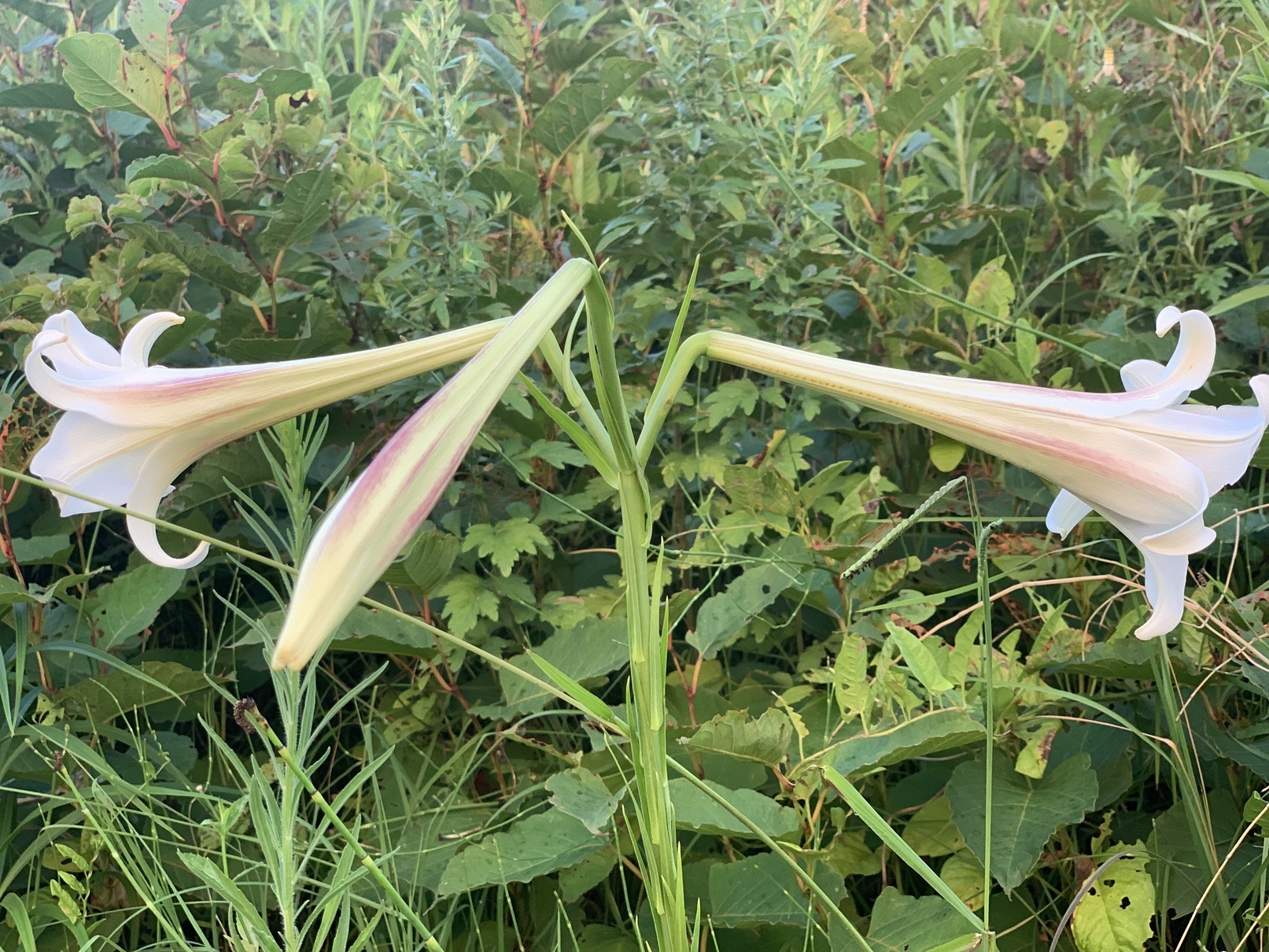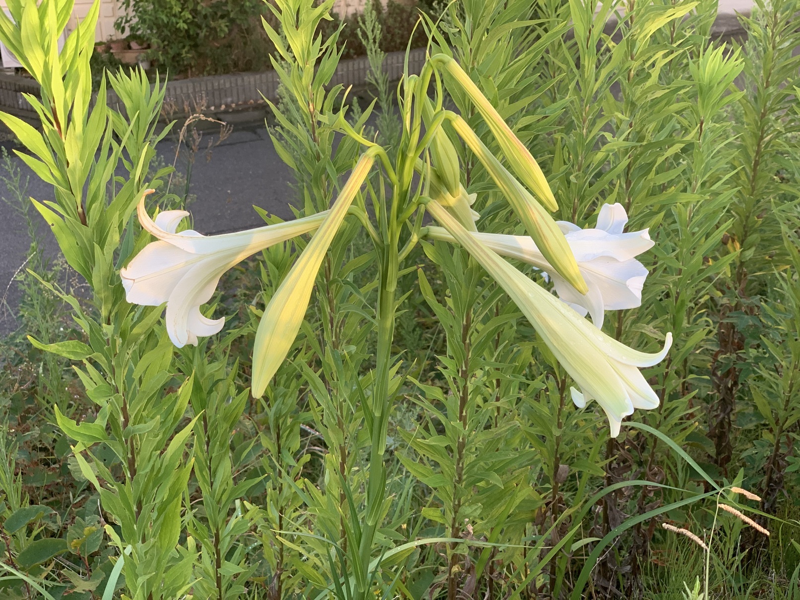 8月8日は暦の上では立秋でした。 が、秋とはいっても名ばかりで、まだまだ暑さが続きそう 河川敷を歩いていると草木の緑の中で、ひときわ目を引く白い花があります、「タカサゴユリ」です。 台湾原産のユリで、台湾の古称が「高砂国」であることから名づけられました。 沖縄や奄美諸島で4−6月に咲き、すがすがしい良い匂いがする日本原種の「テッポウユリ」に似ています。 「テッポウユリ」よりも大型で、匂いはなく、花は同じ白ですが薄い紫色の筋が入っていて、少し下に傾き咲くのが特徴です。 茎に細い葉を密につけていることから「ホソバテッポウユリ」と呼ばれることも。 花期はお盆シーズン、まさに今 タカサゴユリを観賞に散歩に出かけてみてはいかがですか 補足) とてもきれいな花なのですが、生命力が強いこの「タカサゴユリ」が増えることで「ヤマユリ」「カサブランカ」など日本原種のユリの自生地が奪われてしまう恐れがあるようです。 タンポポもですが外来種が増加し、日本古来の品種がなかなか見られなくなっているのはさみしいですね |