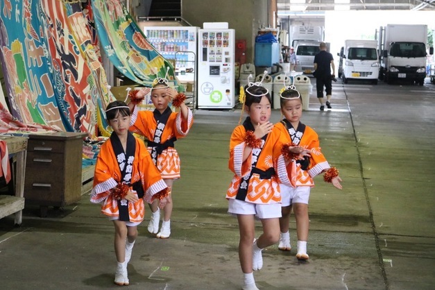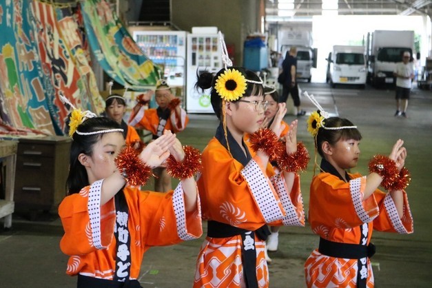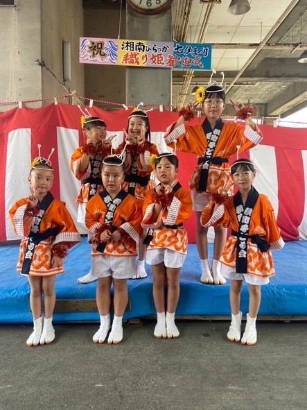 札場横町子供会からも7人の子どもが参加してくれました 横町カラーのオレンジ色の法被(はっぴ)を纏い、ひまわりの髪飾りやモールのブレスレットなどとても素敵に着飾った子供たちが、七夕おどりを披露し、市長や織り姫たちの訪問を歓迎しました。 コロナにより数年ぶりに七夕おどりを踊る子どもや初めて踊る子どもばかり、皆とても上手に踊れていました〜🌻 暑い中ご苦労様でした | ||