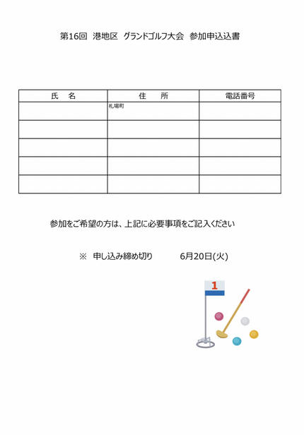 7月2日(日)港小学校校庭にて、第16回港地区グランドゴルフ大会が開催されます。港地区在住の方ならどなたでも参加できます。 参加を希望される方は、班ごとに回覧しています参加申込書(お知らせの裏面)に『氏名・住所・電話番号』をご記入下さい。 皆さまのご参加をお待ちしております | |