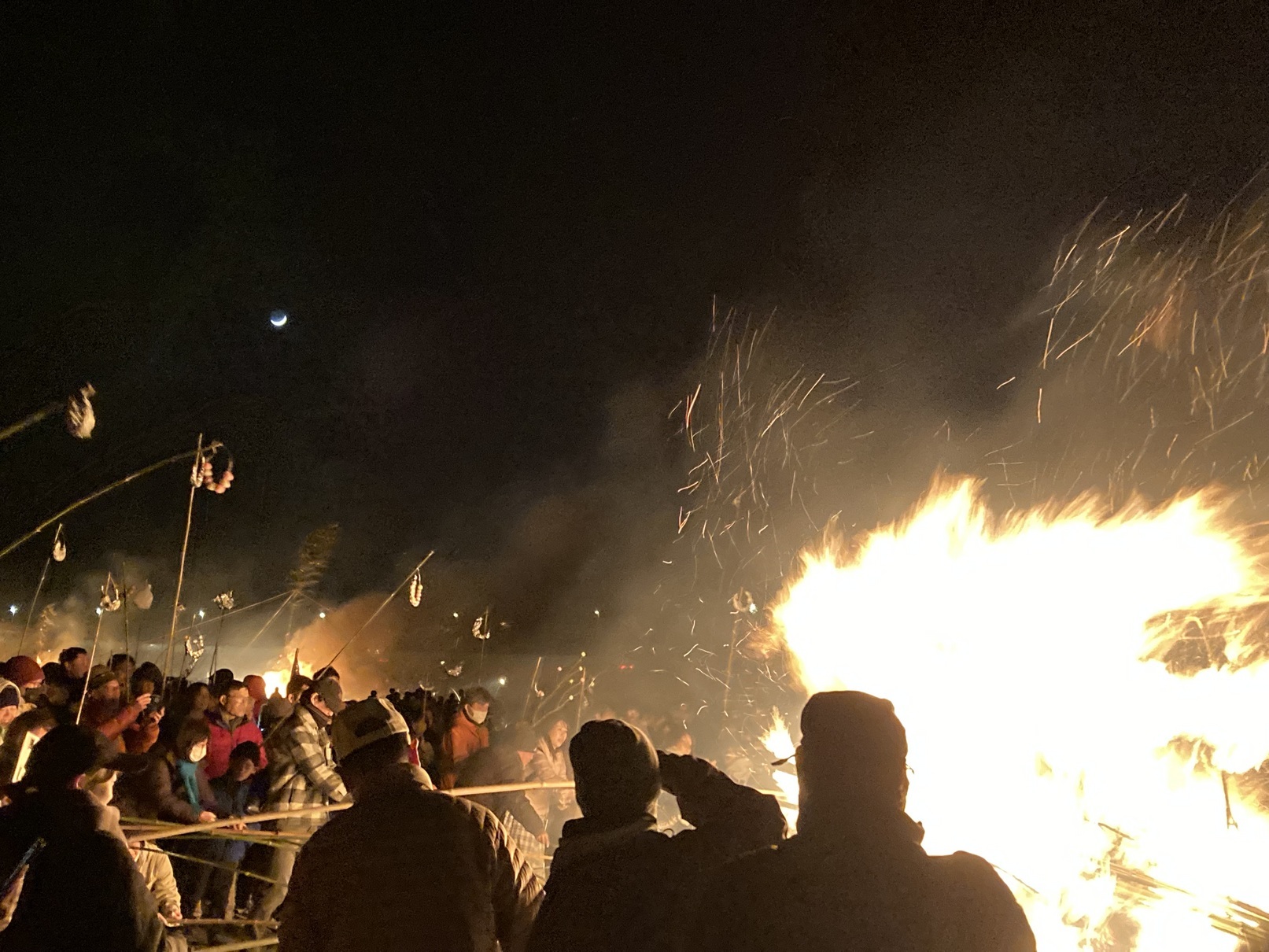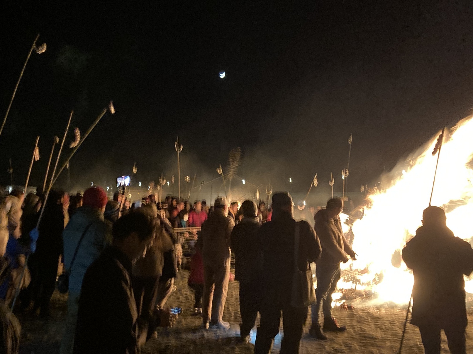 2024年1月14日大磯北浜海岸で「大磯 差議長」が 4年ぶりに開催され大勢の住民が参加していました。 1月14日前後に行われ家内安全、無病息災を願って行われるセエノカミサン(道祖神)の火祭りでセエトバレエ(どんど焼き)の火で焼いたダンゴを食べると風邪をひかないと言われ、2本の竹の先端に7〜8個の団子をぶら下げて参加しました。 18時30分、9基の正月飾りを集めた高さ7〜8mのサイトに、その年の恵方の方角(2024年は東北東)から 一斉に点火され参加者は早く焼こうと我先に団子を火にかざしていました。 今年は海から陸に向かって風が強く、参加者は風上に密集したため場所取りが大変でしたが無事団子を焼いて一つ頂きました。 今年1年風を引きませんように!!!「担当:U」 |