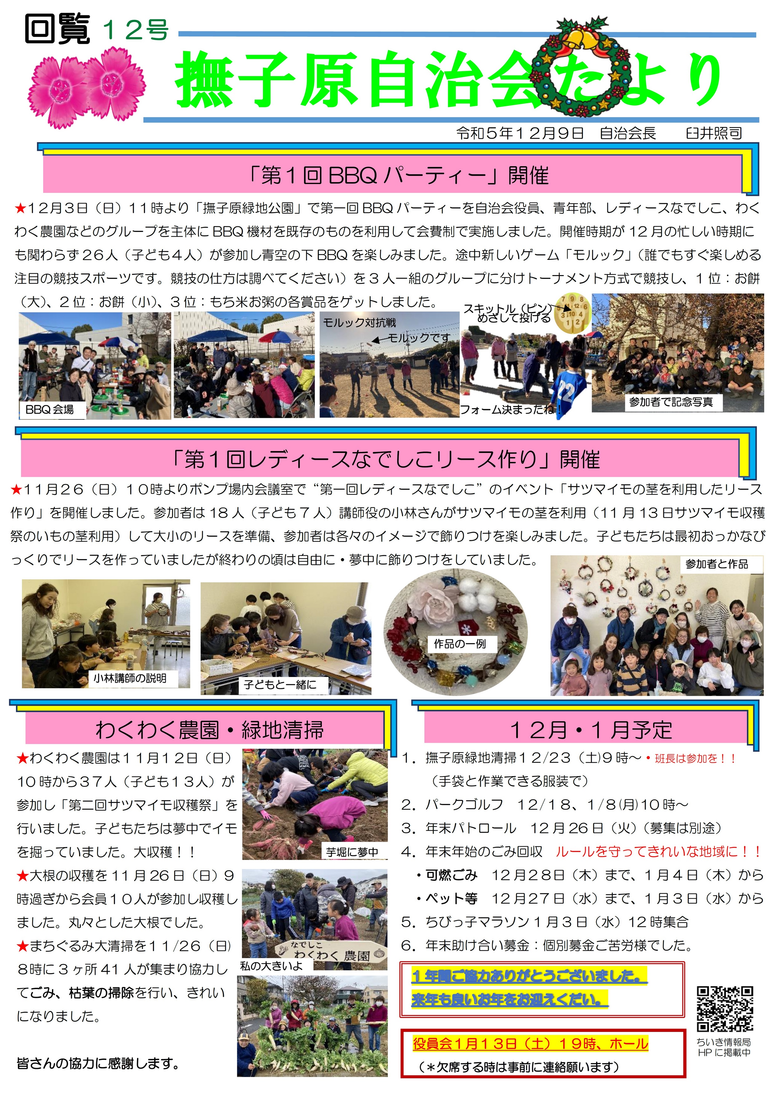 撫子原自治会は12月3日(日)11時より「なでしこ緑地公園」にて第一回BBQパーティーを自治会役員、青年部、レディースなでしこ、わくわく農園などのグループを主体にBBQ機材を準備しながら会費制で実施しました。 開催時期が12月の忙しい時期にも関わらず26人(子どもの参加は4人)が参加し小春日和の青空の下、BBQを楽しみました。 新しいゲーム「モルック」(誰でもすぐ出来ボーリングに似た新しいスポーツでフィンランドが発祥とのこと)を3人一組に分かれトーナメント方式で競技を行い、 1位:大袋のお餅、2位:小袋のお餅、3位:お粥の各商品をゲットし、食べて・飲んで・ゲームを楽しんで地域の交流を図りました。 残念なのはレディースなでしこのグループは子育て世代が多く、子どもの習い事で参加できない方がいて、次回は参加できるような計画を立てる必要があります。 「担当:U」 |