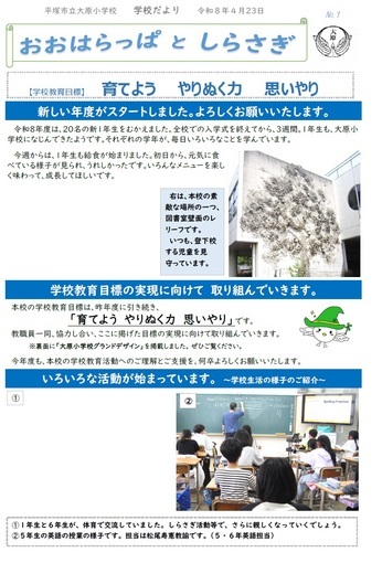 「おおはらっぱと しらさぎ」という名前の学校だよりです。 なお、写真の一部は省略していますので、ご了承ください。 今年度もどうぞよろしくお願いします。 |
