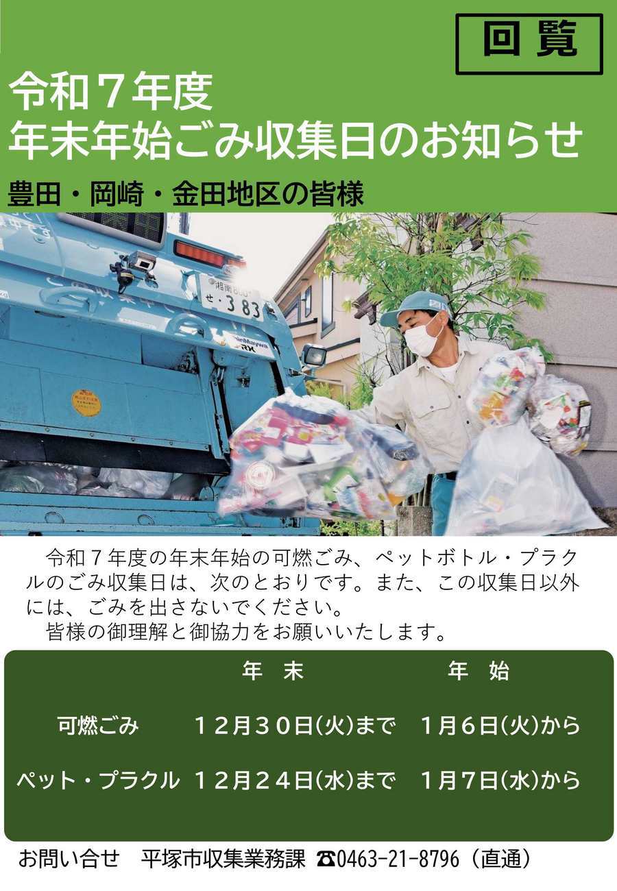 ・【豊田・岡崎・金田】令和7年度年末年始ごみ収集日のお知らせ ※添付のPDFデータをご参照ください。 ・平塚市ごみ通信第46号(1ページ目) ・平塚市ごみ通信第46号(2ページ目) ・平自連だより111号(1ページ目) ・平自連だより111号(2ページ目) |