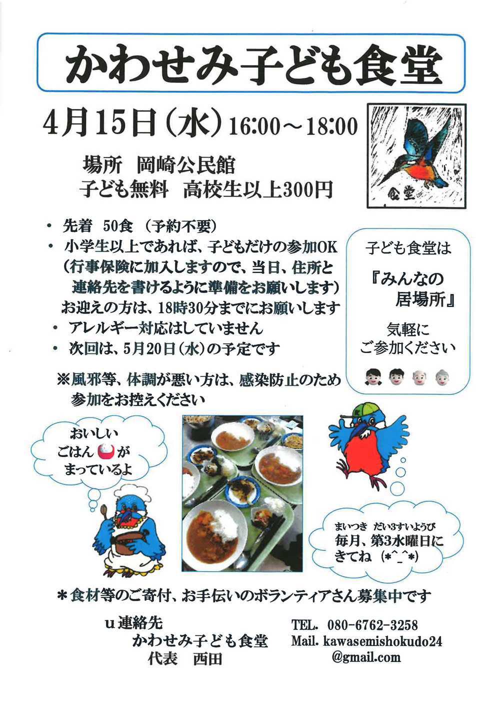 4月15日(水)「かわせみ子ども食堂」が16時から開催される予定です。食材の調達状況により、献立は柔軟に変化していきます。詳細が決まる当日には、あらためてお知らせする予定です。皆さま、お楽しみに。