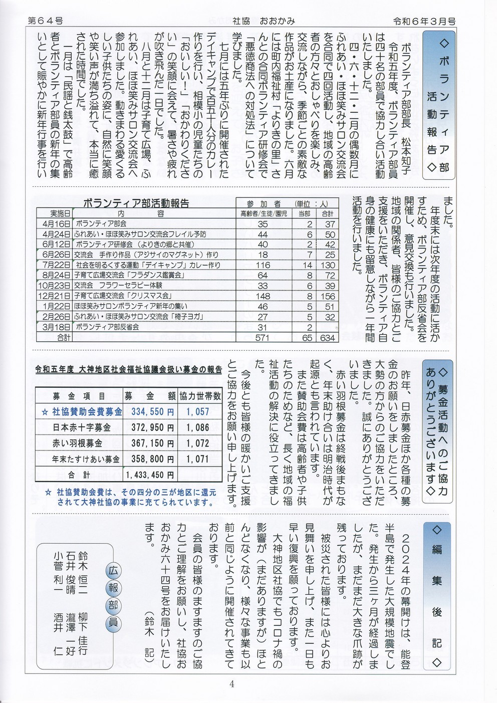 協議会の総会を行いました。 令和5年度の活動報告、決算報告、令和6年度 の事業計画、予算が審議され、賛成多数で 承認されました。 最後に20年の長きにわたり社会福祉活動に 尽力頂いたボランティア副部長の上野順子さんが 表彰されました。 長年の福祉活動誠にありがとう ございました。これからも宜しくお願い致します。 先週の4月7日には大神自治会の総会が 開催され、本年度の活動が開始されました。 本年度も皆様と共に、安心・安全な明るい 街づくりを目指して活動してまいります。 皆様のご協力をお願いいたします。 広報担当 |